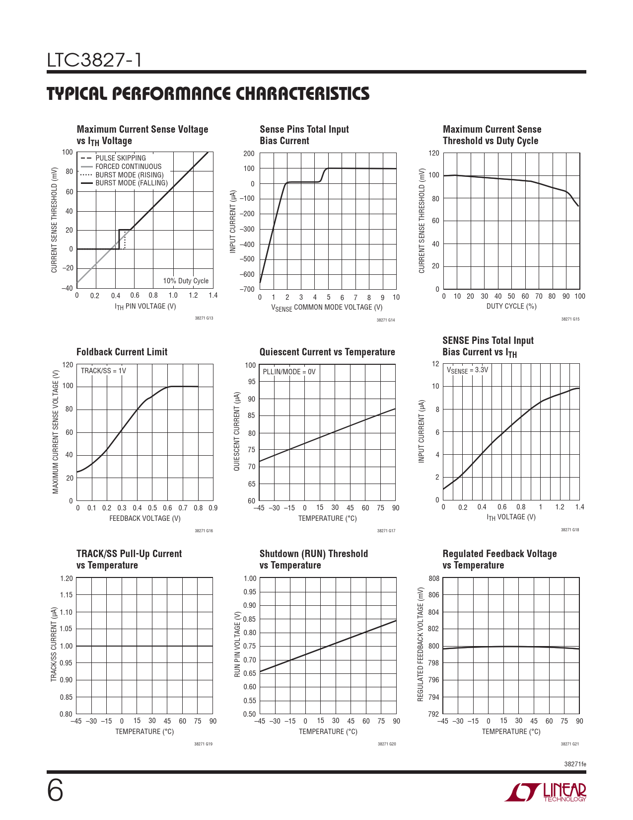 120 100 12 TRACK/SS = 1V PLLIN/MODE = 0V VSENSE = 3.3V 95 100 10 90 80 8 85 60 80 6 75 40 4 INPUT CURRENT (μA) QUIESCENT CURRENT (μA) 70 20 2 65 MAXIMUM CURRENT SENSE VOLTAGE (V) 0 60 0 0 0.1 0.2 0.3 0.4 0.5 0.6 0.7 0.8 0.9 –45 –30 –15 0 15 30 45 60 75 90 0 0.2 0.4 0.6 0.8 1 1.2 1.4 FEEDBACK VOLTAGE (V) TEMPERATURE (°C) ITH VOLTAGE (V) 38271 G16 38271 G17 38271 G18