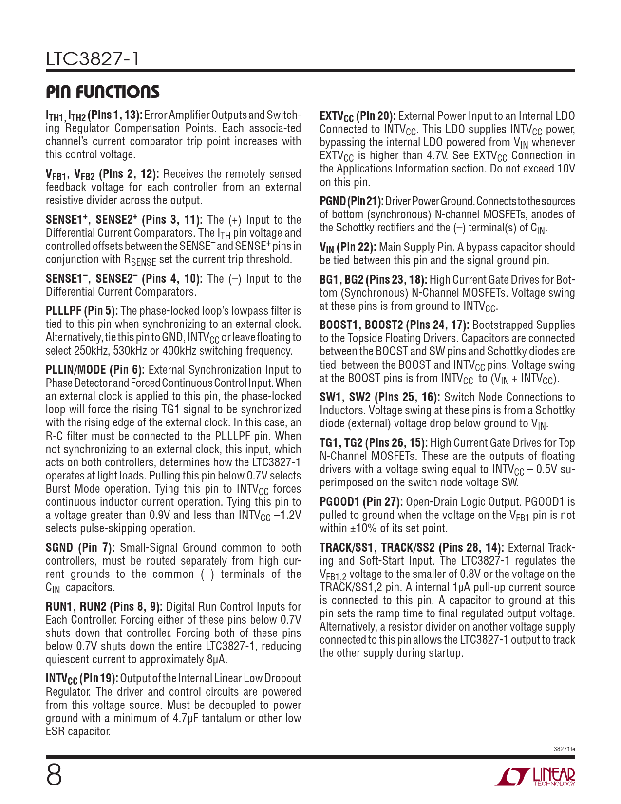 页数 / 页32 / 8 — PIN FUNCTIONS. ITH1, ITH2 (Pins 1, 13):. EXTVCC (Pin 20):. FB1, VFB2 …