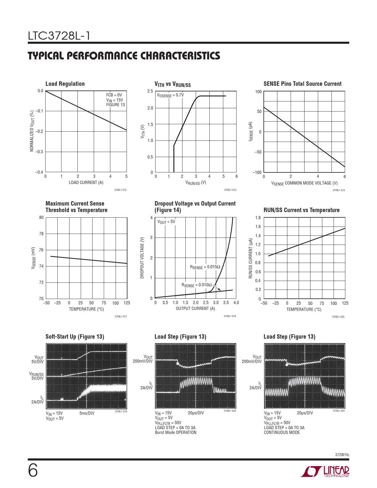 0.0 2.5 100 FCB = 0V VOSENSE = 0.7V VIN = 15V FIGURE 13 2.0 –0.1 50 (%) OUT 1.5 (μA) –0.2 (V) 0 ITHV 1.0 I SENSE NORMALIZED V –0.3 –50 0.5 –0.4 0 –100 0 1 2 3 4 5 0 1 2 3 4 5 6 0 2 4 6 LOAD CURRENT (A) VRUN/SS (V) VSENSE COMMON MODE VOLTAGE (V) 3728L1 G13 3728L1 G14 3728L1 G15