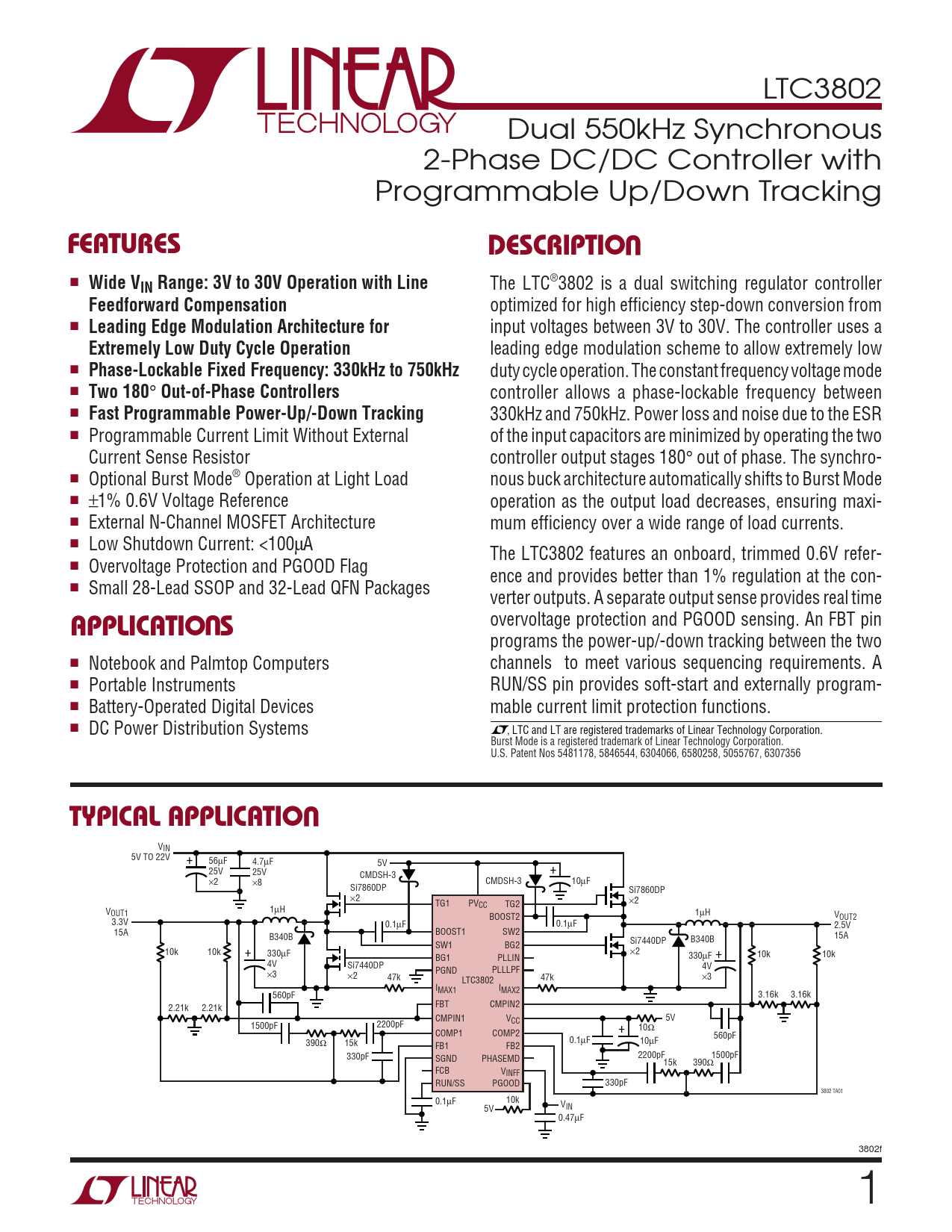 LTC3802 Dual 550kHz Synchronous 2-Phase DC/DC Controller with Programmable Up/Down Tracking UFEATURESDESCRIPTIO ■ Wide VIN Range: 3V to 30V Operation with Line The LTC®3802 is a dual switching regulator controller Feedforward Compensation optimized for high efficiency step-down conversion from ■ Leading Edge Modulation Architecture for input voltages between 3V to 30V. The controller uses a Extremely Low Duty Cycle Operation leading edge modulation scheme to allow extremely low ■ Phase-Lockable Fixed Frequency: 330kHz to 750kHz duty cycle operation. The constant frequency voltage mode ■ Two 180 ° Out-of-Phase Controllers controller allows a phase-lockable frequency between ■ Fast Programmable Power-Up/-Down Tracking 330kHz and 750kHz. Power loss and noise due to the ESR ■ Programmable Current Limit Without External of the input capacitors are minimized by operating the two Current Sense Resistor controller output stages 180° out of phase. The synchro- ■ Optional Burst Mode® Operation at Light Load nous buck architecture automatically shifts to Burst Mode ■ ±1% 0.6V Voltage Reference operation as the output load decreases, ensuring maxi- ■ External N-Channel MOSFET Architecture mum efficiency over a wide range of load currents. ■ Low Shutdown Current: <100µA The LTC3802 features an onboard, trimmed 0.6V refer- ■ Overvoltage Protection and PGOOD Flag ence and provides better than 1% regulation at the con- ■ Small 28-Lead SSOP and 32-Lead QFN Packages verter outputs. A separate output sense provides real time U overvoltage protection and PGOOD sensing. An FBT pin APPLICATIO S programs the power-up/-down tracking between the two ■ Notebook and Palmtop Computers channels to meet various sequencing requirements. A ■ Portable Instruments RUN/SS pin provides soft-start and externally program- ■ Battery-Operated Digital Devices mable current limit protection functions. ■ DC Power Distribution Systems , LTC and LT are registered trademarks of Linear Technology Corporation. Burst Mode is a registered trademark of Linear Technology Corporation. U.S. Patent Nos 5481178, 5846544, 6304066, 6580258, 5055767, 6307356 UTYPICAL APPLICATIO VIN 5V TO 22V + 56µF 4.7µF 5V 25V 25V + CMDSH-3 ×2 ×8 CMDSH-3 10µF Si7860DP Si7860DP ×2 TG1 PV ×2 CC TG2 1 V µH OUT1 BOOST2 1µH VOUT2 3.3V 0.1µF 0.1µF 2.5V 15A BOOST1 SW2 B340B 15A Si7440DP B340B SW1 BG2 10k 10k + 330µF ×2 330µF + BG1 PLLIN 10k 10k 4V Si7440DP PGND PLLLPF 4V ×3 ×2 47k 47k ×3 LTC3802 I I MAX1 MAX2 560pF 3.16k 3.16k FBT CMPIN2 2.21k 2.21k CMPIN1 VCC 5V 1500pF 2200pF 10 + Ω COMP1 COMP2 560pF 390Ω 15k 0.1µF 10µF FB1 FB2 330pF SGND PHASEMD 2200pF 1500pF 15k 390Ω FCB VINFF RUN/SS PGOOD 330pF 3802 TA01 0.1 10k µF V 5V IN 0.47µF 3802f 1