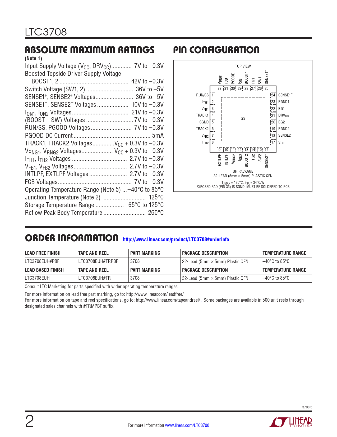 LTC3708EUH LTC3708EUH#TR 3708 32-Lead (5mm × 5mm) Plastic QFN –40°C to 85°C Consult LTC Marketing for parts specified with wider operating temperature ranges. For more information on lead free part marking, go to: http://www.linear.com/leadfree/ For more information on tape and reel specifications, go to: http://www.linear.com/tapeandreel/ . Some packages are available in 500 unit reels through designated sales channels with #TRMPBF suffix. 3708fc 2 For more information www.linear.com/LTC3708 Document Outline Features Description Applications Typical Application Absolute Maximum Ratings Pin Configuration Electrical Characteristics Typical Performance Characteristics Pin Functions Operation Applications Information Package Description Typical Application Related Parts