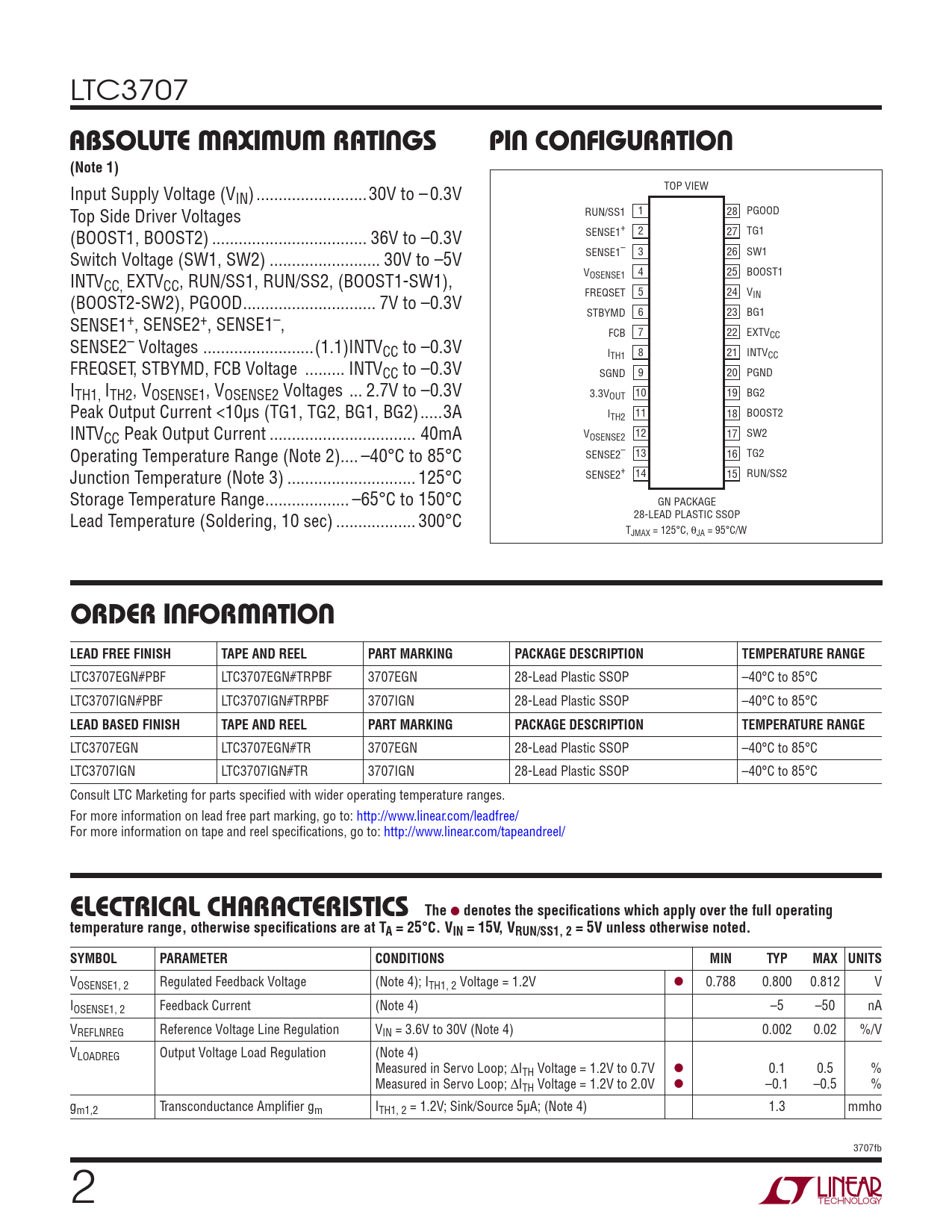 LTC3707 ABSOLUTE MAXIMUM RATINGSPIN CONFIGURATION(Note 1) Input Supply Voltage (V TOP VIEW IN) ... 30V to – 0.3V Top Side Driver Voltages RUN/SS1 1 28 PGOOD (BOOST1, BOOST2) ... 36V to –0.3V SENSE1+ 2 27 TG1 SENSE1– 3 SW1 Switch Voltage (SW1, SW2) ... 30V to –5V 26 V 4 25 BOOST1 INTV OSENSE1 CC, EXTVCC, RUN/SS1, RUN/SS2, (BOOST1-SW1), FREQSET 5 24 VIN (BOOST2-SW2), PGOOD .. 7V to –0.3V STBYMD 6 23 BG1 SENSE1+, SENSE2+, SENSE1–, FCB 7 22 EXTVCC SENSE2– Voltages ...(1.1)INTVCC to –0.3V I 8 21 TH1 INTVCC FREQSET, STBYMD, FCB Voltage ... INTVCC to –0.3V SGND 9 20 PGND ITH1, ITH2, VOSENSE1, VOSENSE2 Voltages ... 2.7V to –0.3V 3.3V 10 19 OUT BG2 Peak Output Current <10μs (TG1, TG2, BG1, BG2) ...3A I 11 18 TH2 BOOST2 INTVCC Peak Output Current ... 40mA V 12 17 OSENSE2 SW2 Operating Temperature Range (Note 2).. –40°C to 85°C SENSE2– 13 16 TG2 Junction Temperature (Note 3) ... 125°C SENSE2+ 14 15 RUN/SS2 Storage Temperature Range ... –65°C to 150°C GN PACKAGE Lead Temperature (Soldering, 10 sec) .. 300°C 28-LEAD PLASTIC SSOP TJMAX = 125°C, θJA = 95°C/W ORDER INFORMATIONLEAD FREE FINISHTAPE AND REELPART MARKINGPACKAGE DESCRIPTIONTEMPERATURE RANGE LTC3707EGN#PBF LTC3707EGN#TRPBF 3707EGN 28-Lead Plastic SSOP –40°C to 85°C LTC3707IGN#PBF LTC3707IGN#TRPBF 3707IGN 28-Lead Plastic SSOP –40°C to 85°C LEAD BASED FINISHTAPE AND REELPART MARKINGPACKAGE DESCRIPTIONTEMPERATURE RANGE LTC3707EGN LTC3707EGN#TR 3707EGN 28-Lead Plastic SSOP –40°C to 85°C LTC3707IGN LTC3707IGN#TR 3707IGN 28-Lead Plastic SSOP –40°C to 85°C Consult LTC Marketing for parts specifi ed with wider operating temperature ranges. For more information on lead free part marking, go to: http://www.linear.com/leadfree/ For more information on tape and reel specifi cations, go to: http://www.linear.com/tapeandreel/ ELECTRICAL CHARACTERISTICSThe l denotes the specifi cations which apply over the full operatingtemperature range, otherwise specifi cations are at TA = 25°C. VIN = 15V, VRUN/SS1, 2 = 5V unless otherwise noted.SYMBOLPARAMETERCONDITIONSMINTYPMAX UNITS VOSENSE1, 2 Regulated Feedback Voltage (Note 4); ITH1, 2 Voltage = 1.2V l 0.788 0.800 0.812 V IOSENSE1, 2 Feedback Current (Note 4) –5 –50 nA VREFLNREG Reference Voltage Line Regulation VIN = 3.6V to 30V (Note 4) 0.002 0.02 %/V VLOADREG Output Voltage Load Regulation (Note 4) Measured in Servo Loop; ΔITH Voltage = 1.2V to 0.7V l 0.1 0.5 % Measured in Servo Loop; ΔITH Voltage = 1.2V to 2.0V l –0.1 –0.5 % gm1,2 Transconductance Amplifi er gm ITH1, 2 = 1.2V; Sink/Source 5μA; (Note 4) 1.3 mmho 3707fb 2