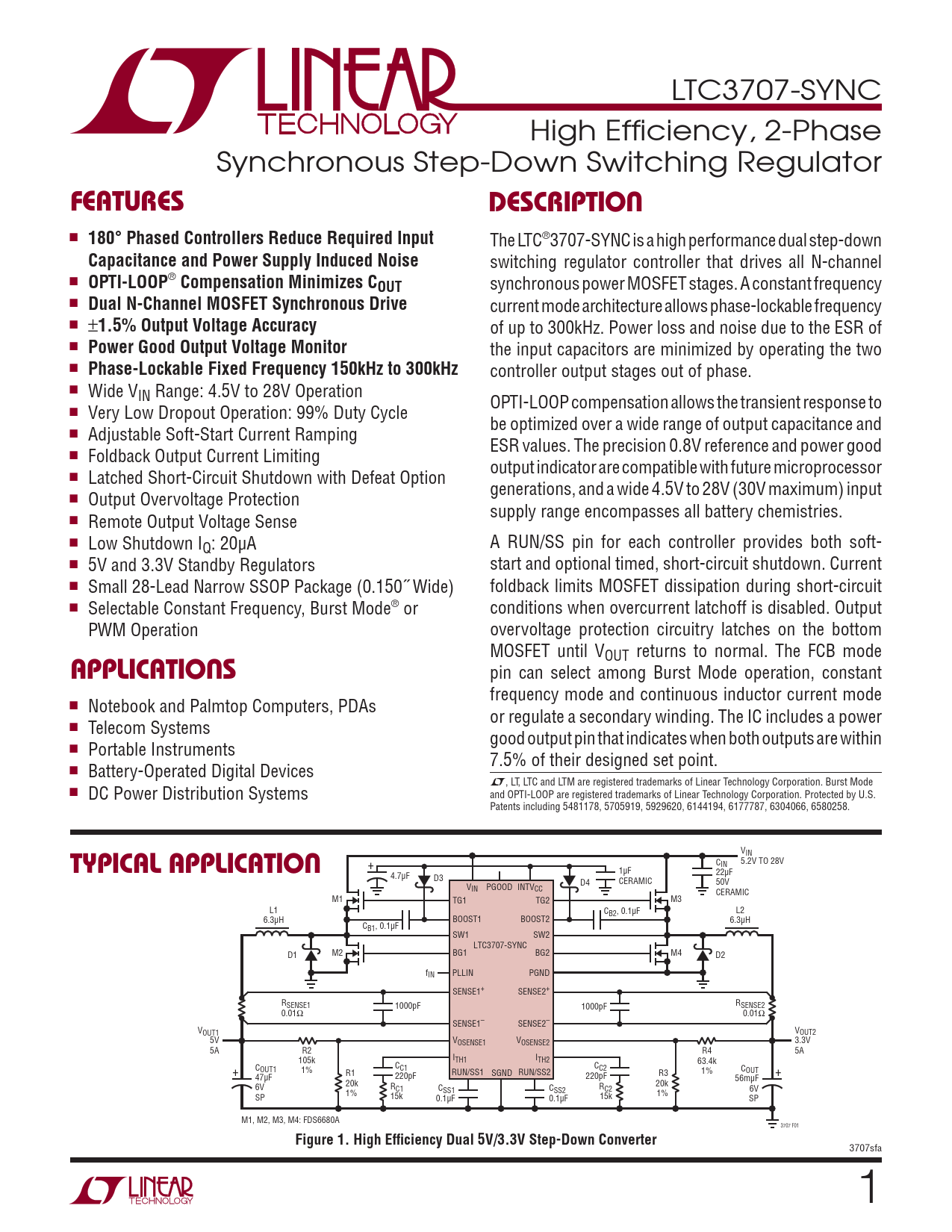LTC3707-SYNC High Effi ciency, 2-Phase Synchronous Step-Down Switching Regulator FEATURESDESCRIPTION n 180° Phased Controllers Reduce Required Input The LTC®3707-SYNC is a high performance dual step-down Capacitance and Power Supply Induced Noise switching regulator controller that drives all N-channel n OPTI-LOOP ® Compensation Minimizes COUT synchronous power MOSFET stages. A constant frequency n Dual N-Channel MOSFET Synchronous Drive current mode architecture allows phase-lockable frequency n ± 1.5% Output Voltage Accuracy of up to 300kHz. Power loss and noise due to the ESR of n Power Good Output Voltage Monitor the input capacitors are minimized by operating the two n Phase-Lockable Fixed Frequency 150kHz to 300kHz controller output stages out of phase. n Wide VIN Range: 4.5V to 28V Operation OPTI-LOOP compensation allows the transient response to n Very Low Dropout Operation: 99% Duty Cycle be optimized over a wide range of output capacitance and n Adjustable Soft-Start Current Ramping ESR values. The precision 0.8V reference and power good n Foldback Output Current Limiting output indicator are compatible with future microprocessor n Latched Short-Circuit Shutdown with Defeat Option generations, and a wide 4.5V to 28V (30V maximum) input n Output Overvoltage Protection supply range encompasses all battery chemistries. n Remote Output Voltage Sense n Low Shutdown I A RUN/SS pin for each controller provides both soft- Q: 20μA n 5V and 3.3V Standby Regulators start and optional timed, short-circuit shutdown. Current n Small 28-Lead Narrow SSOP Package (0.150˝ Wide) foldback limits MOSFET dissipation during short-circuit n Selectable Constant Frequency, Burst Mode® or conditions when overcurrent latchoff is disabled. Output PWM Operation overvoltage protection circuitry latches on the bottom MOSFET until VOUT returns to normal. The FCB mode APPLICATIONS pin can select among Burst Mode operation, constant frequency mode and continuous inductor current mode n Notebook and Palmtop Computers, PDAs or regulate a secondary winding. The IC includes a power n Telecom Systems good output pin that indicates when both outputs are within n Portable Instruments 7.5% of their designed set point. n Battery-Operated Digital Devices L, LT, LTC and LTM are registered trademarks of Linear Technology Corporation. Burst Mode n DC Power Distribution Systems and OPTI-LOOP are registered trademarks of Linear Technology Corporation. Protected by U.S. Patents including 5481178, 5705919, 5929620, 6144194, 6177787, 6304066, 6580258. V TYPICAL APPLICATION IN + C 5.2V TO 28V IN 1μF 4.7μF 22μF D3 D4 CERAMIC 50V VIN PGOOD INTVCC CERAMIC M1 TG1 TG2 M3 L1 CB2, 0.1μF L2 6.3μH BOOST1 BOOST2 6.3μH CB1, 0.1μF SW1 SW2 LTC3707-SYNC D1 M2 BG1 BG2 M4 D2 f PLLIN PGND IN SENSE1+ SENSE2+ RSENSE1 1000pF 1000pF RSENSE2 0.01Ω 0.01Ω SENSE1– SENSE2– VOUT1 VOUT2 5V VOSENSE1 VOSENSE2 3.3V 5A R2 R4 5A 105k ITH1 ITH2 63.4k C C 1% C1 + COUT1 C2 1% COUT RUN/SS1 SGND RUN/SS2 R3 + 47μF R1 220pF 220pF 56mμF 6V 20k R 20k C1 R C C C2 SS1 SS2 6V SP 1% 15k 1% 15k 0.1μF 0.1μF SP M1, M2, M3, M4: FDS6680A 3707 F01 Figure 1. High Effi ciency Dual 5V/3.3V Step-Down Converter 3707sfa 1