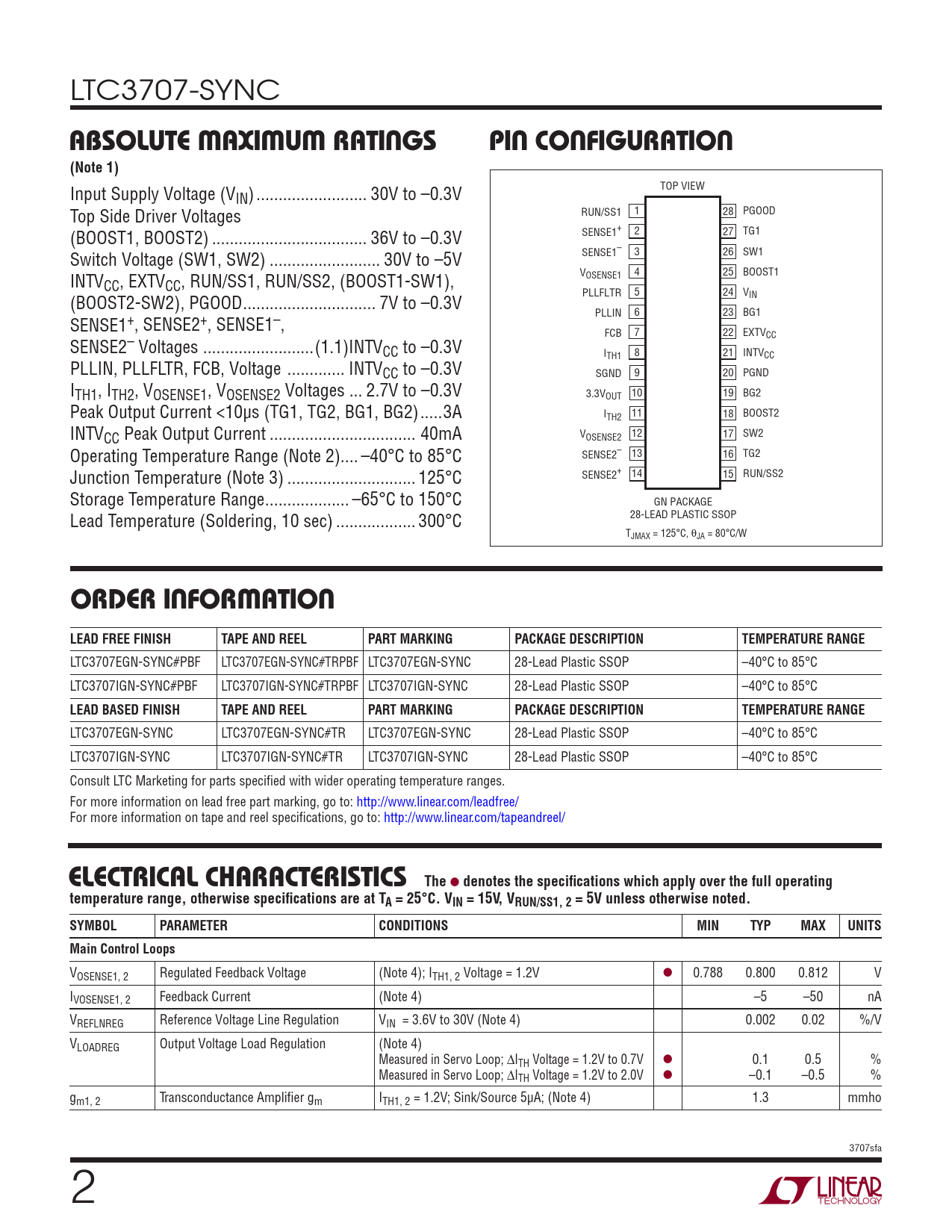 LTC3707EGN-SYNC#PBF LTC3707EGN-SYNC#TRPBF LTC3707EGN-SYNC 28-Lead Plastic SSOP –40°C to 85°C LTC3707IGN-SYNC#PBF LTC3707IGN-SYNC#TRPBF LTC3707IGN-SYNC 28-Lead Plastic SSOP –40°C to 85°C