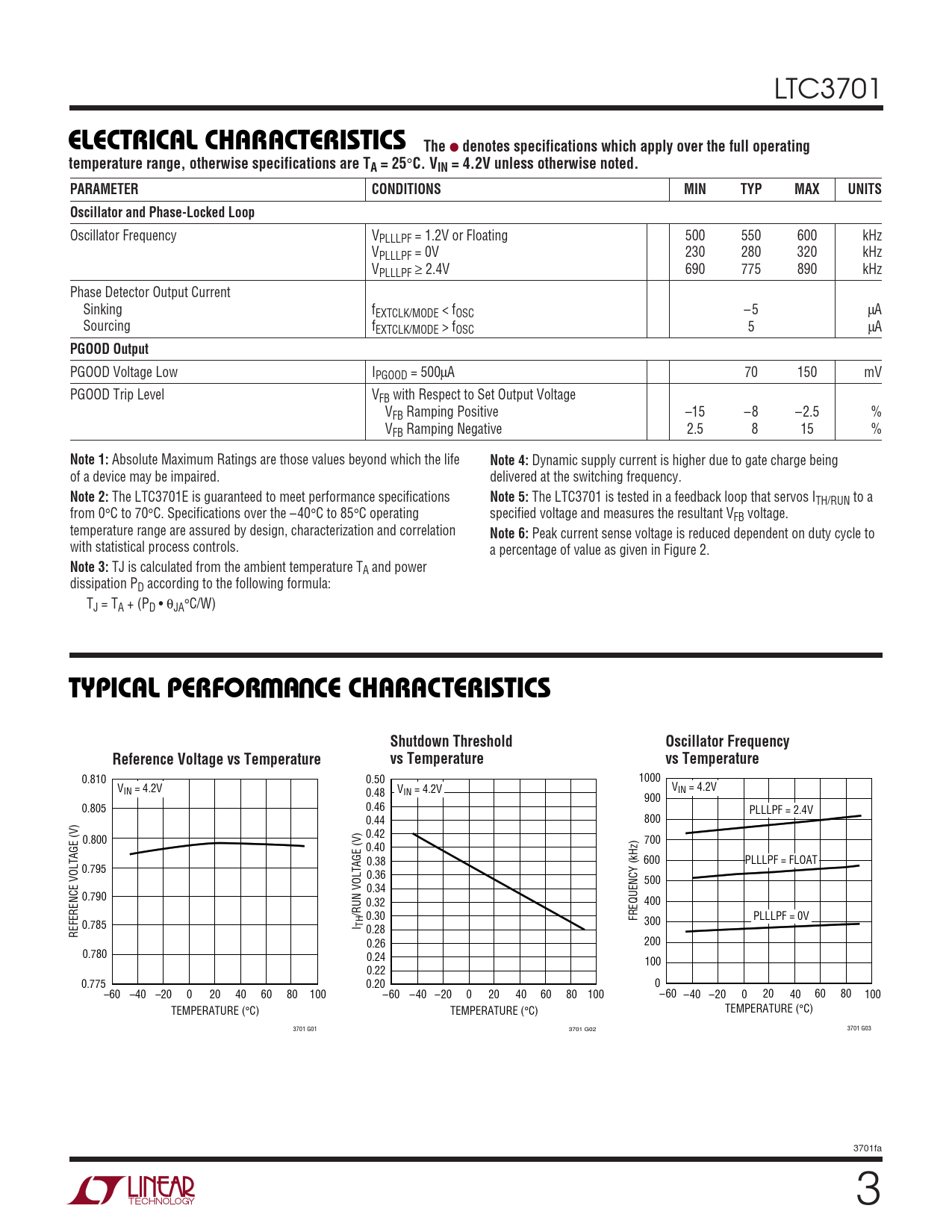 LTC3701 ELECTRICAL CHARACTERISTICS The ● denotes specifications which apply over the full operatingtemperature range, otherwise specifications are TA = 25 ° C. VIN = 4.2V unless otherwise noted.PARAMETERCONDITIONSMINTYPMAXUNITSOscillator and Phase-Locked Loop Oscillator Frequency VPLLLPF = 1.2V or Floating 500 550 600 kHz VPLLLPF = 0V 230 280 320 kHz VPLLLPF ≥ 2.4V 690 775 890 kHz Phase Detector Output Current Sinking fEXTCLK/MODE < fOSC – 5 µA Sourcing fEXTCLK/MODE > fOSC 5 µA PGOOD Output PGOOD Voltage Low IPGOOD = 500µA 70 150 mV PGOOD Trip Level VFB with Respect to Set Output Voltage VFB Ramping Positive –15 –8 –2.5 % VFB Ramping Negative 2.5 8 15 % Note 1: Absolute Maximum Ratings are those values beyond which the life Note 4: Dynamic supply current is higher due to gate charge being of a device may be impaired. delivered at the switching frequency. Note 2: The LTC3701E is guaranteed to meet performance specifications Note 5: The LTC3701 is tested in a feedback loop that servos ITH/RUN to a from 0°C to 70°C. Specifications over the –40°C to 85°C operating specified voltage and measures the resultant VFB voltage. temperature range are assured by design, characterization and correlation Note 6: Peak current sense voltage is reduced dependent on duty cycle to with statistical process controls. a percentage of value as given in Figure 2. Note 3: TJ is calculated from the ambient temperature TA and power dissipation PD according to the following formula: TJ = TA + (PD • θJA°C/W) WUTYPICAL PERFOR A CE CHARACTERISTICSShutdown ThresholdOscillator FrequencyReference Voltage vs Temperaturevs Temperaturevs Temperature 0.810 0.50 1000 VIN = 4.2V V 0.48 VIN = 4.2V IN = 4.2V 900 0.805 0.46 PLLLPF = 2.4V 0.44 800 0.42 0.800 700 0.40 0.38 600 PLLLPF = FLOAT 0.795 0.36 500 0.34 0.790 0.32 400 /RUN VOLTAGE (V) 0.30 FREQUENCY (kHz) PLLLPF = 0V 0.785 I TH 300 REFERENCE VOLTAGE (V) 0.28 0.26 200 0.780 0.24 100 0.22 0.775 0.20 0 –60 –40 –20 0 20 40 60 80 100 –60 –40 –20 0 20 40 60 80 100 –60 –40 –20 0 20 40 60 80 100 TEMPERATURE (°C) TEMPERATURE (°C) TEMPERATURE (°C) 3701 G01 3701 G02 3701 G03 3701fa 3