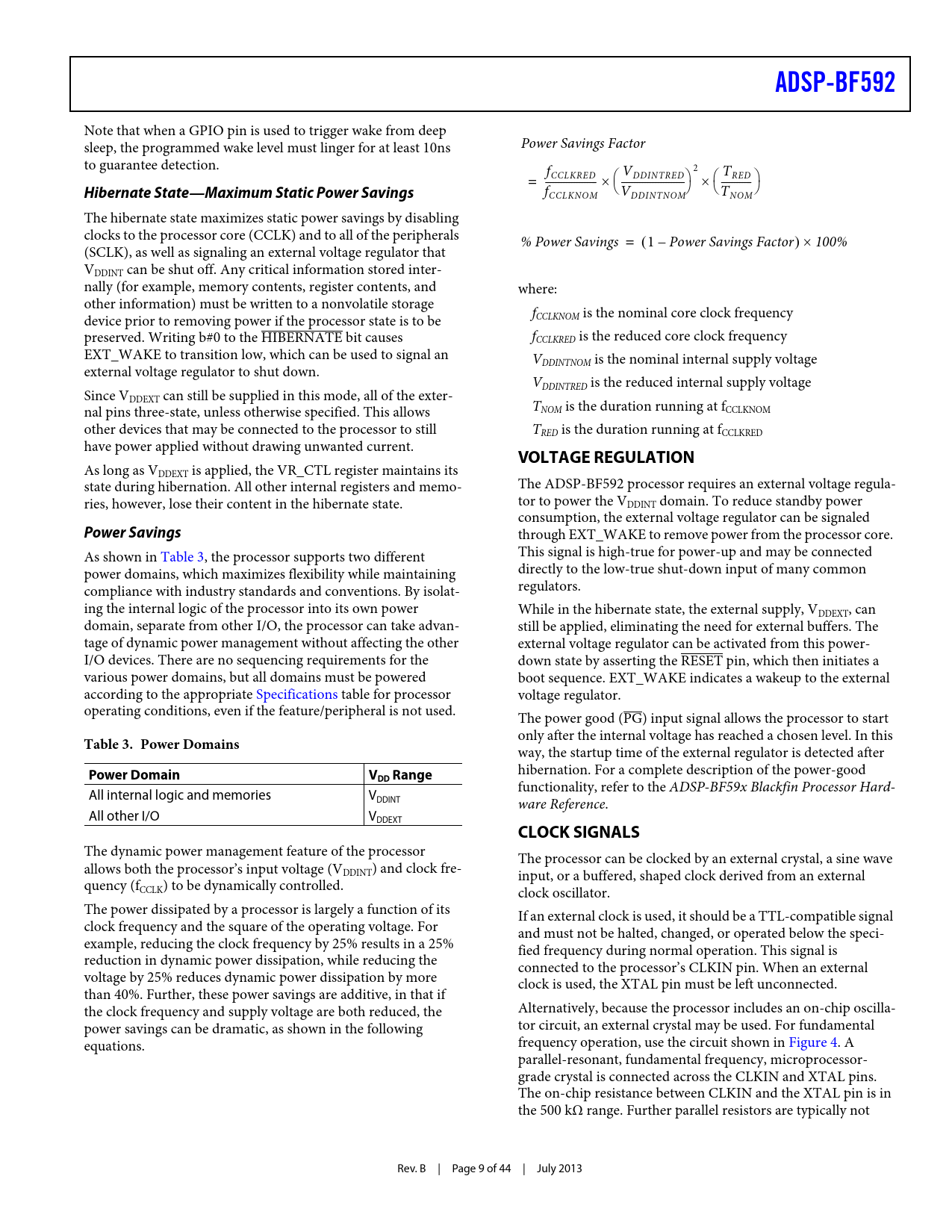 f     CCLKNOM VDDINTNOM TNOM The hibernate state maximizes static power savings by disabling clocks to the processor core (CCLK) and to all of the peripherals % Power Savings = 1 – Power Savings Factor  100% (SCLK), as well as signaling an external voltage regulator that VDDINT can be shut off. Any critical information stored inter- nally (for example, memory contents, register contents, and where: other information) must be written to a nonvolatile storage f device prior to removing power if the processor state is to be CCLKNOM is the nominal core clock frequency preserved. Writing b#0 to the HIBERNATE bit causes fCCLKRED is the reduced core clock frequency EXT_WAKE to transition low, which can be used to signal an VDDINTNOM is the nominal internal supply voltage external voltage regulator to shut down. VDDINTRED is the reduced internal supply voltage Since VDDEXT can still be supplied in this mode, all of the exter- nal pins three-state, unless otherwise specified. This allows TNOM is the duration running at fCCLKNOM other devices that may be connected to the processor to still TRED is the duration running at fCCLKRED have power applied without drawing unwanted current.