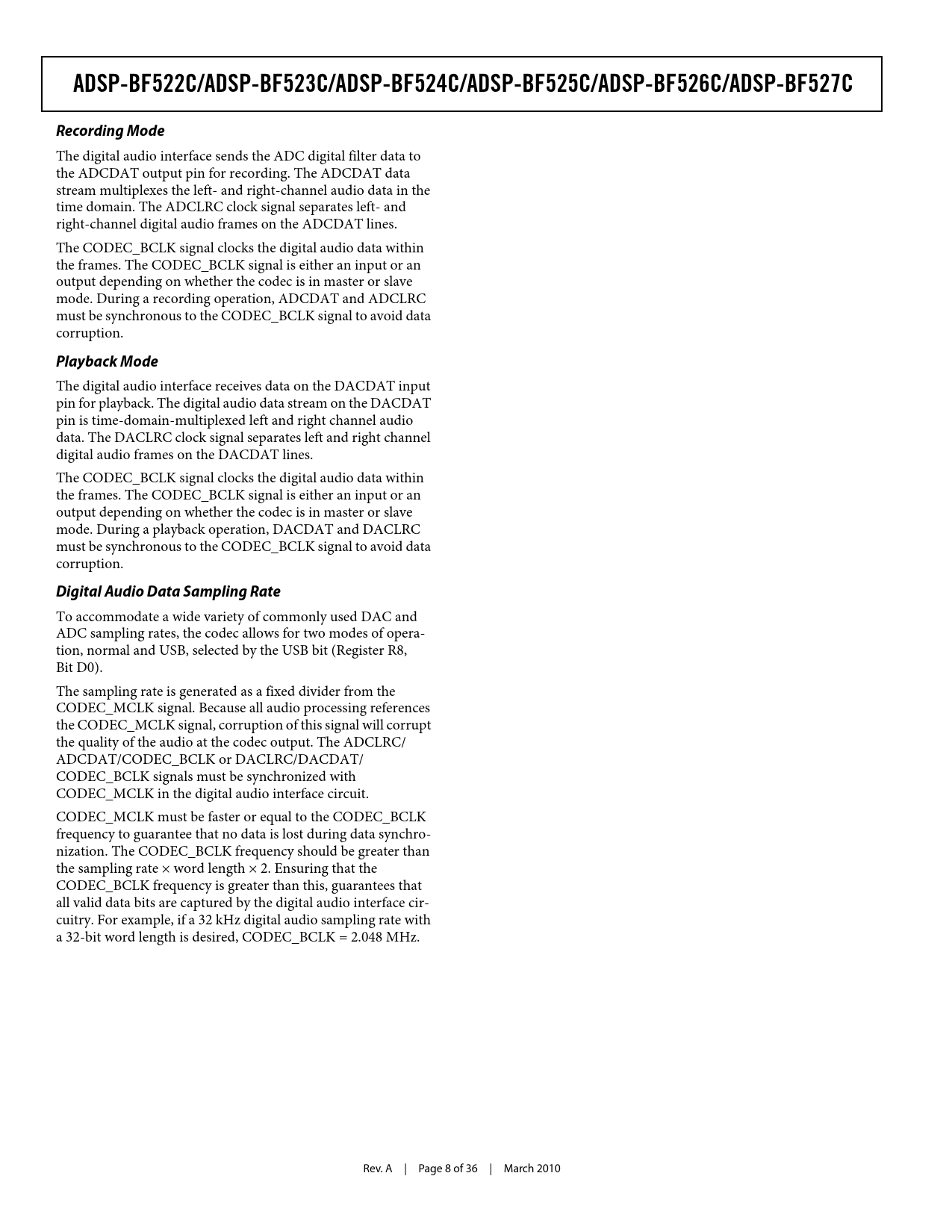 To accommodate a wide variety of commonly used DAC and ADC sampling rates, the codec allows for two modes of opera- tion, normal and USB, selected by the USB bit (Register R8, Bit D0). The sampling rate is generated as a fixed divider from the CODEC_MCLK signal. Because all audio processing references the CODEC_MCLK signal, corruption of this signal will corrupt the quality of the audio at the codec output. The ADCLRC/ ADCDAT/CODEC_BCLK or DACLRC/DACDAT/ CODEC_BCLK signals must be synchronized with CODEC_MCLK in the digital audio interface circuit. CODEC_MCLK must be faster or equal to the CODEC_BCLK frequency to guarantee that no data is lost during data synchro- nization. The CODEC_BCLK frequency should be greater than the sampling rate × word length × 2. Ensuring that the CODEC_BCLK frequency is greater than this, guarantees that all valid data bits are captured by the digital audio interface cir- cuitry. For example, if a 32 kHz digital audio sampling rate with a 32-bit word length is desired, CODEC_BCLK = 2.048 MHz. Rev. A | Page 8 of 36 | March 2010 Document Outline Blackfin Embedded Processor with Codec Processor Features Embedded Codec Features Peripherals Table of Contents Revision History General Description Codec Description ADC and DAC ADC High-Pass and DAC De-Emphasis Filters Analog Audio Interfaces Stereo Line and Monaural Microphone Inputs Bypass and Sidetone Paths to Output Line and Headphone Outputs Digital Audio Interface Recording Mode Playback Mode Digital Audio Data Sampling Rate Normal Mode USB Mode Software Control Interface Codec Pin Descriptions Register Details Bit Descriptions Specifications Operating Conditions Codec Electrical Characteristics Absolute Maximum Ratings ESD Sensitivity Package Information Power Consumption Timing Specifications TWI Timing SPI Timing Digital Audio Interface Slave Mode Timing Digital Audio Interface Master Mode Timing System Clock Timing Digital Filter Characteristics Converter Filter Response Digital De-Emphasis 289-Ball CSP_BGA Ball Assignment Outline Dimensions Ordering Guide