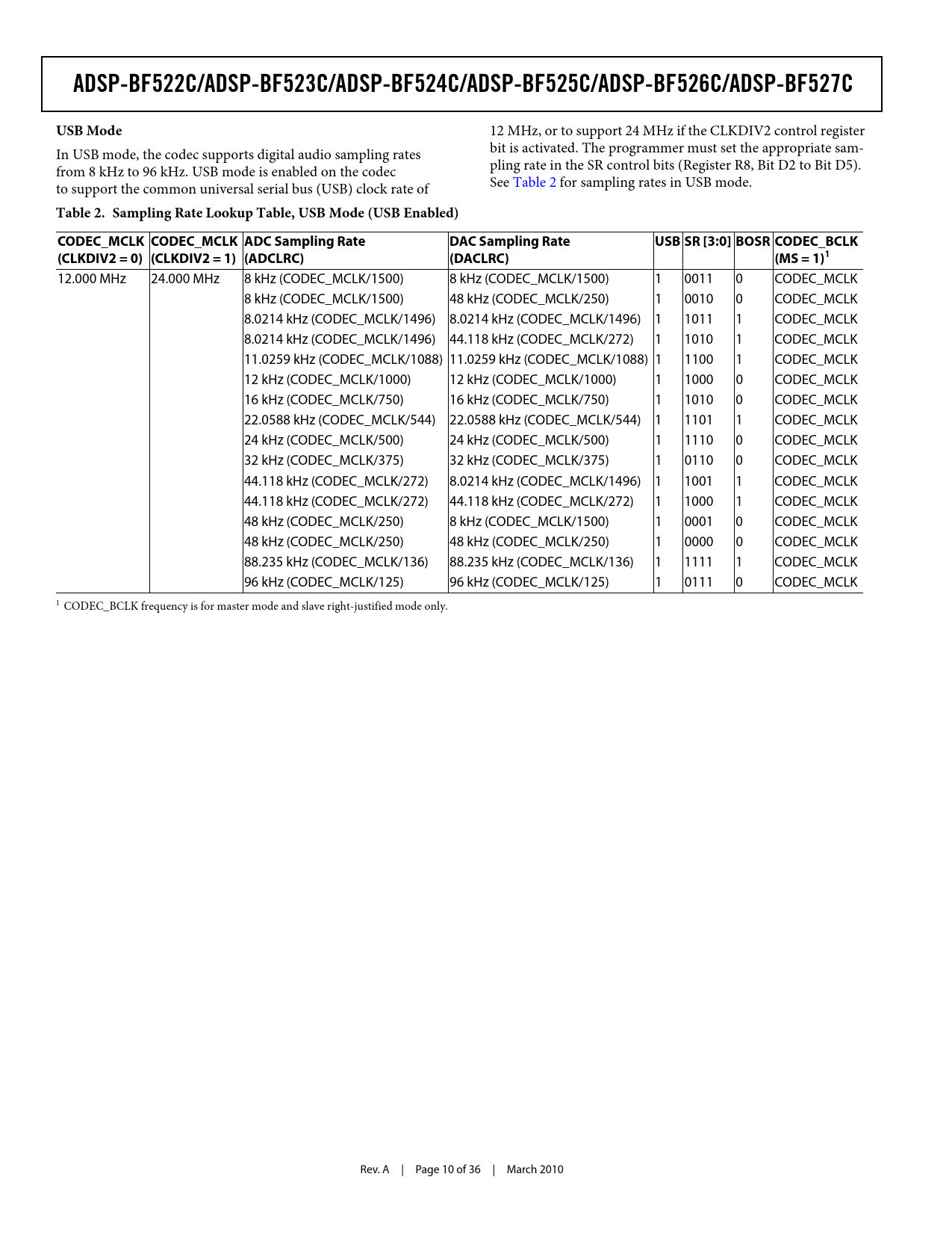 | 页数 / 页 | 36 / 10 — USB Mode. Table 2. Sampling Rate Lookup Table, USB Mode (USB Enabled). … |
