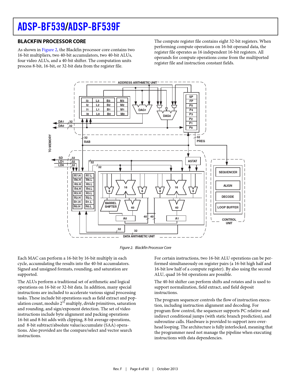 link to page 4 ADSP-BF539/ADSP-BF539FBLACKFIN PROCESSOR CORE The compute register file contains eight 32-bit registers. When performing compute operations on 16-bit operand data, the As shown in Figure 2, the Blackfin processor core contains two register file operates as 16 independent 16-bit registers. All 16-bit multipliers, two 40-bit accumulators, two 40-bit ALUs, operands for compute operations come from the multiported four video ALUs, and a 40-bit shifter. The computation units register file and instruction constant fields. process 8-bit, 16-bit, or 32-bit data from the register file. ADDRESS ARITHMETIC UNITSPI3L3B3M3FPI2L2B2M2P5I1L1B1M1DAG1P4I0L0B0M0P3DAG0P2DA132P1DA032P0Y3232 PREGRABMEMOR O TSD32LD132ASTAT32LD03232SEQUENCERR7.HR7.LR6.HR6.LR5.HR5.LALIGN1616R4.HR4.L8888R3.HR3.LDECODER2.HR2.LR1.HR1.LBARRELR0.HR0.LSHIFTER4040LOOP BUFFER4040A0A1CONTROLUNIT3232DATA ARITHMETIC UNIT Figure 2. Blackfin Processor Core Each MAC can perform a 16-bit by 16-bit multiply in each For certain instructions, two 16-bit ALU operations can be per- cycle, accumulating the results into the 40-bit accumulators. formed simultaneously on register pairs (a 16-bit high half and Signed and unsigned formats, rounding, and saturation are 16-bit low half of a compute register). By also using the second supported. ALU, quad 16-bit operations are possible. The ALUs perform a traditional set of arithmetic and logical The 40-bit shifter can perform shifts and rotates and is used to operations on 16-bit or 32-bit data. In addition, many special support normalization, field extract, and field deposit instructions are included to accelerate various signal processing instructions. tasks. These include bit operations such as field extract and pop- The program sequencer controls the flow of instruction execu- ulation count, modulo 232 multiply, divide primitives, saturation tion, including instruction alignment and decoding. For and rounding, and sign/exponent detection. The set of video program flow control, the sequencer supports PC relative and instructions include byte alignment and packing operations indirect conditional jumps (with static branch prediction), and 16-bit and 8-bit adds with clipping, 8-bit average operations, subroutine calls. Hardware is provided to support zero over- and 8-bit subtract/absolute value/accumulate (SAA) opera- head looping. The architecture is fully interlocked, meaning that tions. Also provided are the compare/select and vector search the programmer need not manage the pipeline when executing instructions. instructions with data dependencies. Rev. F | Page 4 of 60 | October 2013 Document Outline Blackfin Embedded Processor Features Memory Peripherals Table Of Contents Revision History General Description Low Power Architecture System Integration ADSP-BF539/ADSP-BF539F Processor Peripherals Blackfin Processor Core Memory Architecture Internal (On-Chip) Memory External (Off-Chip) Memory Flash Memory (ADSP-BF539F Only) Flash Memory Programming Flash Memory Sector Protection I/O Memory Space Booting Event Handling Core Event Controller (CEC) System Interrupt Controller (SIC) Event Control DMA Controllers Real-Time Clock Watchdog Timer Timers Serial Ports (SPORTs) Serial Peripheral Interface (SPI) Ports 2-Wire Interface UART Ports Programmable I/O Pins Programmable Flags (GPIO Port F) General-Purpose I/O Ports C, D, and E Parallel Peripheral Interface General-Purpose Mode Descriptions Input Mode Frame Capture Mode Output Mode ITU-R 656 Mode Descriptions Active Video Only Mode Vertical Blanking Interval Mode Entire Field Mode Controller Area Network (CAN) Interface Media Transceiver MAC layer (MXVR) Dynamic Power Management Full-On Operating Mode—Maximum Performance Active Operating Mode—Moderate Dynamic Power Savings Sleep Operating Mode—High Dynamic Power Savings Deep Sleep Operating Mode—Maximum Dynamic Power Savings Hibernate State—Maximum Static Power Savings Power Savings Voltage Regulation Clock Signals Booting Modes Instruction Set Description Development Tools Integrated Development Environments (IDEs) EZ-KIT Lite Evaluation Board EZ-KIT Lite Evaluation Kits Software Add-Ins for CrossCore Embedded Studio Board Support Packages for Evaluation Hardware Middleware Packages Algorithmic Modules Designing an Emulator-Compatible DSP Board (Target) Example Connections and Layout Considerations MXVR Board Layout Guidelines Voltage Regulator Layout Guidelines Additional Information Related Signal Chains Pin Descriptions Specifications Operating Conditions Electrical Characteristics Absolute Maximum Ratings ESD Sensitivity Package Information Timing Specifications Clock and Reset Timing Asynchronous Memory Read Cycle Timing Asynchronous Memory Write Cycle Timing SDRAM Interface Timing External Port Bus Request and Grant Cycle Timing Parallel Peripheral Interface Timing Serial Ports Timing Serial Peripheral Interface Ports—Master Timing Serial Peripheral Interface Ports—Slave Timing General-Purpose Port Timing Universal Asynchronous Receiver-Transmitter (UART) Ports—Receive and Transmit Timing MXVR Timing Timer Clock Timing Timer Cycle Timing JTAG Test and Emulation Port Timing Output Drive Currents Test Conditions Output Enable Time Measurement Output Disable Time Measurement Example System Hold Time Calculation Capacitive Loading Thermal Characteristics 316-Ball CSP_BGA Ball Assignment Outline Dimensions Surface-Mount Design Ordering Guide