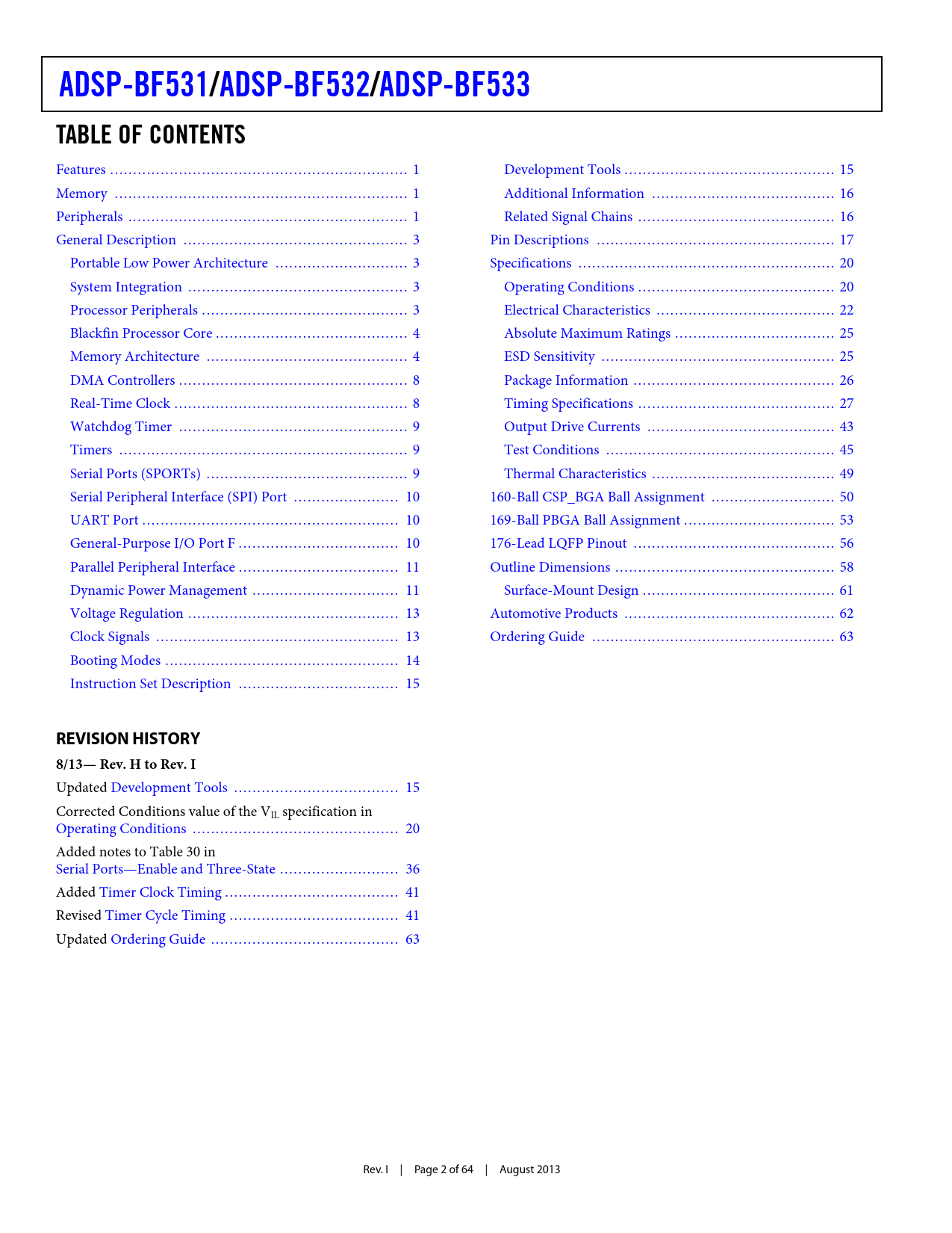 link to page 1 link to page 1 link to page 1 link to page 3 link to page 3 link to page 3 link to page 3 link to page 4 link to page 4 link to page 8 link to page 8 link to page 9 link to page 9 link to page 9 link to page 10 link to page 10 link to page 10 link to page 11 link to page 11 link to page 13 link to page 13 link to page 14 link to page 15 link to page 15 link to page 16 link to page 16 link to page 17 link to page 20 link to page 20 link to page 22 link to page 25 link to page 25 link to page 26 link to page 27 link to page 43 link to page 45 link to page 49 link to page 50 link to page 53 link to page 56 link to page 58 link to page 61 link to page 62 link to page 63 link to page 15 link to page 36 link to page 63 link to page 41 link to page 41 link to page 20 ADSP-BF531/ADSP-BF532/ADSP-BF533TABLE OF CONTENTS Features ... 1 Development Tools .. 15 Memory .. 1 Additional Information .. 16 Peripherals ... 1 Related Signal Chains ... 16 General Description ... 3 Pin Descriptions .. 17 Portable Low Power Architecture ... 3 Specifications .. 20 System Integration .. 3 Operating Conditions ... 20 Processor Peripherals ... 3 Electrical Characteristics ... 22 Blackfin Processor Core .. 4 Absolute Maximum Ratings ... 25 Memory Architecture .. 4 ESD Sensitivity ... 25 DMA Controllers .. 8 Package Information .. 26 Real-Time Clock ... 8 Timing Specifications ... 27 Watchdog Timer .. 9 Output Drive Currents ... 43 Timers ... 9 Test Conditions .. 45 Serial Ports (SPORTs) .. 9 Thermal Characteristics .. 49 Serial Peripheral Interface (SPI) Port ... 10 160-Ball CSP_BGA Ball Assignment ... 50 UART Port .. 10 169-Ball PBGA Ball Assignment ... 53 General-Purpose I/O Port F ... 10 176-Lead LQFP Pinout .. 56 Parallel Peripheral Interface ... 11 Outline Dimensions .. 58 Dynamic Power Management .. 11 Surface-Mount Design .. 61 Voltage Regulation .. 13 Automotive Products .. 62 Clock Signals ... 13 Ordering Guide ... 63 Booting Modes ... 14 Instruction Set Description ... 15 REVISION HISTORY8/13— Rev. H to Rev. I Updated Development Tools .. 15 Corrected Conditions value of the VIL specification in Operating Conditions ... 20 Added notes to Table 30 in Serial Ports—Enable and Three-State .. 36 Added Timer Clock Timing .. 41 Revised Timer Cycle Timing ... 41 Updated Ordering Guide ... 63 Rev. I | Page 2 of 64 | August 2013 Document Outline Blackfin Embedded Processor Features Memory Peripherals Table Of Contents Revision History General Description Portable Low Power Architecture System Integration Processor Peripherals Blackfin Processor Core Memory Architecture Internal (On-Chip) Memory External (Off-Chip) Memory I/O Memory Space Booting Event Handling Core Event Controller (CEC) System Interrupt Controller (SIC) Event Control DMA Controllers Real-Time Clock Watchdog Timer Timers Serial Ports (SPORTs) Serial Peripheral Interface (SPI) Port UART Port General-Purpose I/O Port F Parallel Peripheral Interface General-Purpose Mode Descriptions Input Mode Frame Capture Mode Output Mode ITU-R 656 Mode Descriptions Active Video Only Mode Vertical Blanking Interval Mode Entire Field Mode Dynamic Power Management Full-On Operating Mode—Maximum Performance Active Operating Mode—Moderate Power Savings Sleep Operating Mode—High Dynamic Power Savings Deep Sleep Operating Mode—Maximum Dynamic Power Savings Hibernate State—Maximum Static Power Savings Power Savings Voltage Regulation Voltage Regulator Layout Guidelines Clock Signals Booting Modes Instruction Set Description Development Tools Integrated Development Environments (IDEs) EZ-KIT Lite Evaluation Board EZ-KIT Lite Evaluation Kits Software Add-Ins for CrossCore Embedded Studio Board Support Packages for Evaluation Hardware Middleware Packages Algorithmic Modules Designing an Emulator-Compatible DSP Board (Target) Additional Information Related Signal Chains Pin Descriptions Specifications Operating Conditions Electrical Characteristics Absolute Maximum Ratings ESD Sensitivity Package Information Timing Specifications Clock and Reset Timing Asynchronous Memory Read Cycle Timing Asynchronous Memory Write Cycle Timing SDRAM Interface Timing External Port Bus Request and Grant Cycle Timing Parallel Peripheral Interface Timing Serial Port Timing Serial Peripheral Interface (SPI) Port—Master Timing Serial Peripheral Interface (SPI) Port—Slave Timing General-Purpose I/O Port F Pin Cycle Timing Universal Asynchronous Receiver-Transmitter (UART) Ports—Receive and Transmit Timing Timer Clock Timing Timer Cycle Timing JTAG Test and Emulation Port Timing Output Drive Currents Test Conditions Output Enable Time Measurement Output Disable Time Measurement Example System Hold Time Calculation Capacitive Loading Thermal Characteristics 160-Ball CSP_BGA Ball Assignment 169-Ball PBGA Ball Assignment 176-Lead LQFP Pinout Outline Dimensions Surface-Mount Design Automotive Products Ordering Guide