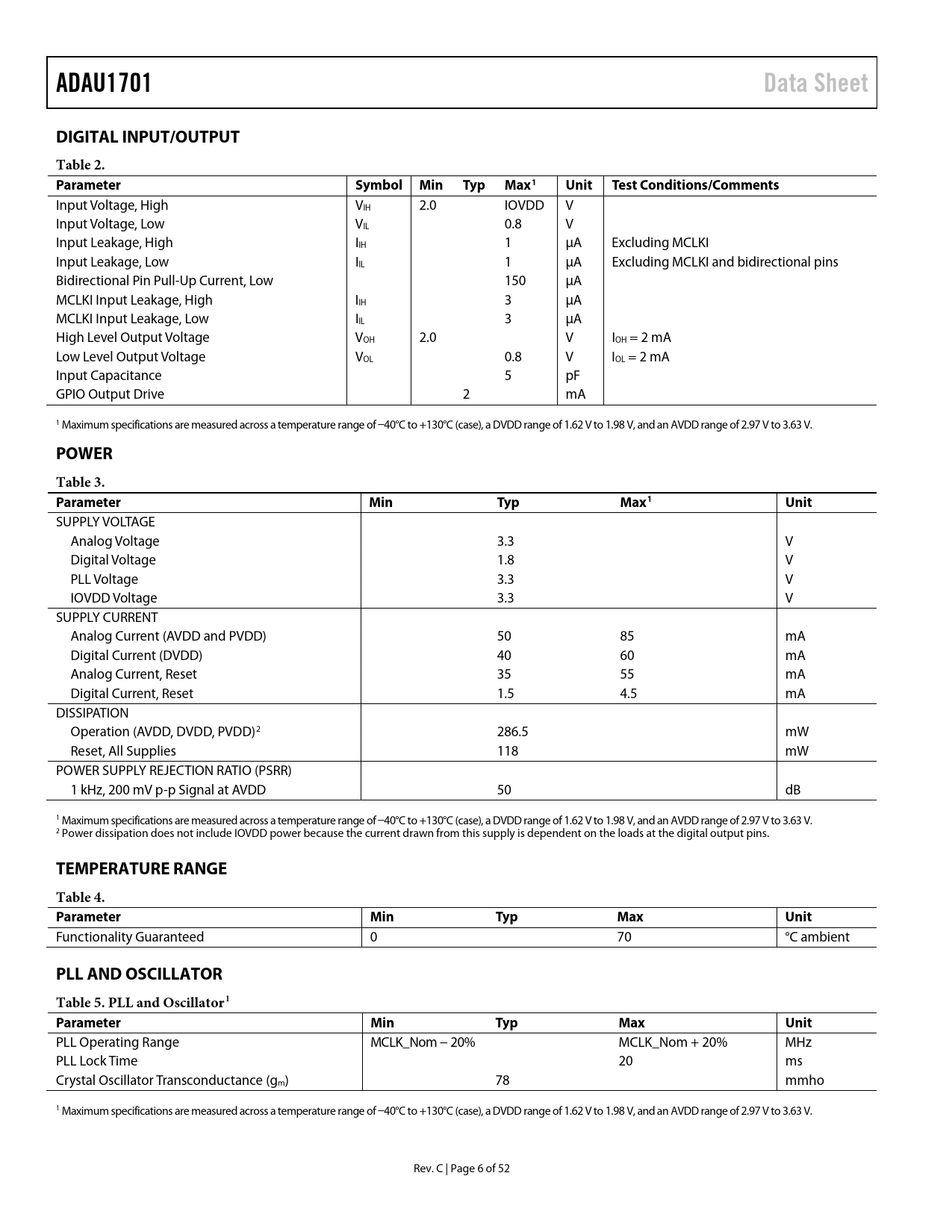 ADAU1701. Data Sheet. DIGITAL INPUT/OUTPUT Table 2. Parameter. Symbol Min. Typ. Max1. Unit Test Conditions/Comments