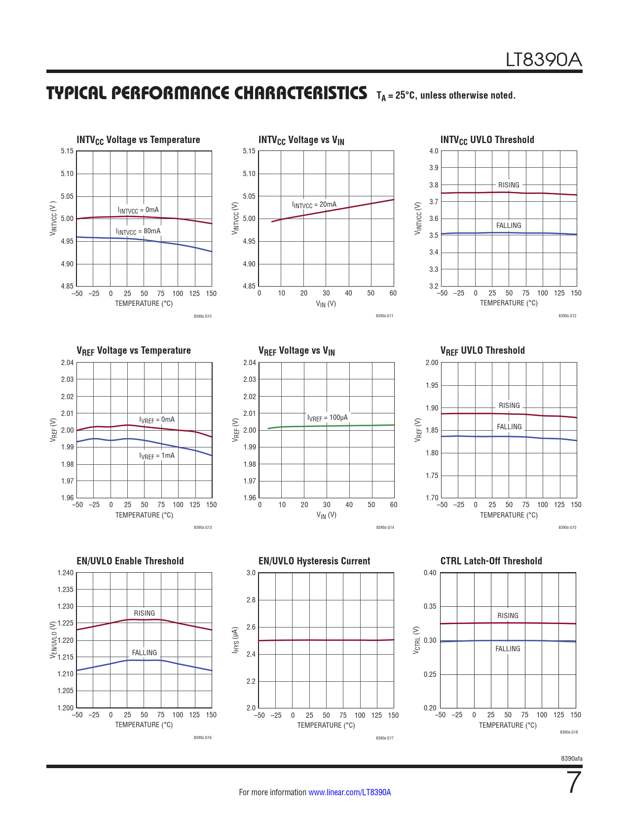 5.15 5.15 4.0 3.9 5.10 5.10 3.8 RISING 5.05 5.05 I 3.7 INTVCC = 20mA (V ) IINTVCC = 0mA (V) (V) VCC 5.00 VCC 5.00 VCC 3.6 FALLING V INT IINTVCC = 80mA V INT V INT 3.5 4.95 4.95 3.4 4.90 4.90 3.3 4.85 4.85 3.2 –50 –25 0 25 50 75 100 125 150 0 10 20 30 40 50 60 –50 –25 0 25 50 75 100 125 150 TEMPERATURE (°C) VIN (V) TEMPERATURE (°C) 8390a G10 8390a G11 8390a G12