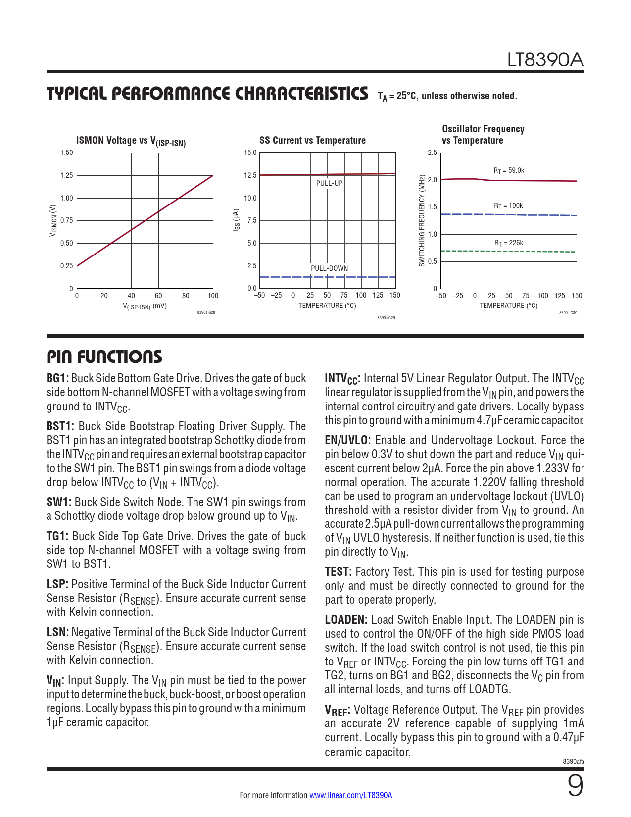 LT8390A TYPICAL PERFORMANCE CHARACTERISTICS TA = 25°C, unless otherwise noted.Oscillator FrequencyISMON Voltage vs V(ISP-ISN)SS Current vs Temperaturevs Temperature 1.50 15.0 2.5 R 1.25 12.5 T = 59.0k PULL-UP 2.0 1.00 10.0 1.5 RT = 100k (V) 0.75 (µA) 7.5 I SS V ISMON 1.0 0.50 5.0 RT = 226k 0.25 2.5 0.5 PULL-DOWN SWITCHING FREQUENCY (MHz) 0 0.0 0 0 20 40 60 80 100 –50 –25 0 25 50 75 100 125 150 –50 –25 0 25 50 75 100 125 150 V(ISP-ISN) (mV) TEMPERATURE (°C) TEMPERATURE (°C) 8390a G28 8390a G30 8390a G29 PIN FUNCTIONS BG1: Buck Side Bottom Gate Drive. Drives the gate of buck INTVCC: Internal 5V Linear Regulator Output. The INTVCC side bottom N-channel MOSFET with a voltage swing from linear regulator is supplied from the VIN pin, and powers the ground to INTVCC. internal control circuitry and gate drivers. Locally bypass BST1: Buck Side Bootstrap Floating Driver Supply. The this pin to ground with a minimum 4.7µF ceramic capacitor. BST1 pin has an integrated bootstrap Schottky diode from EN/UVLO: Enable and Undervoltage Lockout. Force the the INTVCC pin and requires an external bootstrap capacitor pin below 0.3V to shut down the part and reduce VIN qui- to the SW1 pin. The BST1 pin swings from a diode voltage escent current below 2µA. Force the pin above 1.233V for drop below INTVCC to (VIN + INTVCC). normal operation. The accurate 1.220V falling threshold SW1: Buck Side Switch Node. The SW1 pin swings from can be used to program an undervoltage lockout (UVLO) a Schottky diode voltage drop below ground up to V threshold with a resistor divider from VIN to ground. An IN. accurate 2.5µA pull-down current allows the programming TG1: Buck Side Top Gate Drive. Drives the gate of buck of VIN UVLO hysteresis. If neither function is used, tie this side top N-channel MOSFET with a voltage swing from pin directly to VIN. SW1 to BST1. TEST: Factory Test. This pin is used for testing purpose LSP: Positive Terminal of the Buck Side Inductor Current only and must be directly connected to ground for the Sense Resistor (RSENSE). Ensure accurate current sense part to operate properly. with Kelvin connection. LOADEN: Load Switch Enable Input. The LOADEN pin is LSN: Negative Terminal of the Buck Side Inductor Current used to control the ON/OFF of the high side PMOS load Sense Resistor (RSENSE). Ensure accurate current sense switch. If the load switch control is not used, tie this pin with Kelvin connection. to VREF or INTVCC. Forcing the pin low turns off TG1 and V TG2, turns on BG1 and BG2, disconnects the V IN: Input Supply. The VIN pin must be tied to the power C pin from input to determine the buck, buck-boost, or boost operation all internal loads, and turns off LOADTG. regions. Locally bypass this pin to ground with a minimum VREF: Voltage Reference Output. The VREF pin provides 1µF ceramic capacitor. an accurate 2V reference capable of supplying 1mA current. Local y bypass this pin to ground with a 0.47µF ceramic capacitor. 8390afa For more information www.linear.com/LT8390A 9 Document Outline Features Applications Description Typical Application Absolute Maximum Ratings Order Information Electrical Characteristics Typical Performance Characteristics Pin Functions Block Diagram Operation Applications Information Typical Applications Package Description Typical Application Related Parts