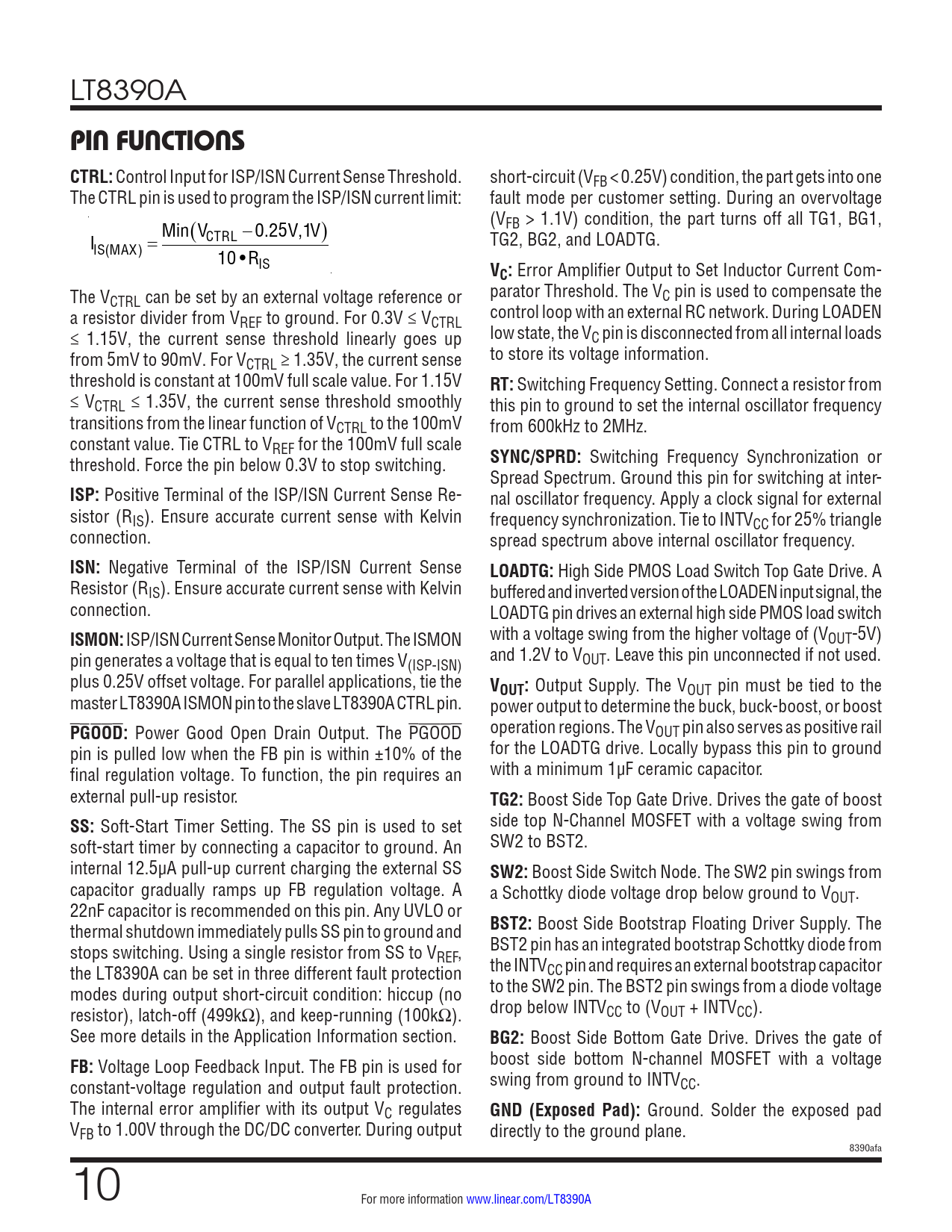 LT8390A PIN FUNCTIONS CTRL: Control Input for ISP/ISN Current Sense Threshold. short-circuit (VFB < 0.25V) condition, the part gets into one The CTRL pin is used to program the ISP/ISN current limit: fault mode per customer setting. During an overvoltage (V Min(V ) FB > 1.1V) condition, the part turns off all TG1, BG1, I CTRL − 0.25V,1V TG2, BG2, and LOADTG. IS(MAX) = 10 •RIS VC: Error Amplifier Output to Set Inductor Current Com- The V parator Threshold. The V CTRL can be set by an external voltage reference or C pin is used to compensate the a resistor divider from V control loop with an external RC network. During LOADEN REF to ground. For 0.3V ≤ VCTRL ≤ 1.15V, the current sense threshold linearly goes up low state, the VC pin is disconnected from all internal loads from 5mV to 90mV. For V to store its voltage information. CTRL ≥ 1.35V, the current sense threshold is constant at 100mV full scale value. For 1.15V RT: Switching Frequency Setting. Connect a resistor from ≤ VCTRL ≤ 1.35V, the current sense threshold smoothly this pin to ground to set the internal oscillator frequency transitions from the linear function of VCTRL to the 100mV from 600kHz to 2MHz. constant value. Tie CTRL to VREF for the 100mV full scale threshold. Force the pin below 0.3V to stop switching. SYNC/SPRD: Switching Frequency Synchronization or Spread Spectrum. Ground this pin for switching at inter- ISP: Positive Terminal of the ISP/ISN Current Sense Re- nal oscillator frequency. Apply a clock signal for external sistor (RIS). Ensure accurate current sense with Kelvin frequency synchronization. Tie to INTVCC for 25% triangle connection. spread spectrum above internal oscillator frequency. ISN: Negative Terminal of the ISP/ISN Current Sense LOADTG: High Side PMOS Load Switch Top Gate Drive. A Resistor (RIS). Ensure accurate current sense with Kelvin buffered and inverted version of the LOADEN input signal, the connection. LOADTG pin drives an external high side PMOS load switch ISMON: ISP/ISN Current Sense Monitor Output. The ISMON with a voltage swing from the higher voltage of (VOUT-5V) pin generates a voltage that is equal to ten times V and 1.2V to V (ISP-ISN) OUT. Leave this pin unconnected if not used. plus 0.25V offset voltage. For parallel applications, tie the VOUT: Output Supply. The VOUT pin must be tied to the master LT8390A ISMON pin to the slave LT8390A CTRL pin. power output to determine the buck, buck-boost, or boost PGOOD: Power Good Open Drain Output. The PGOOD operation regions. The VOUT pin also serves as positive rail pin is pulled low when the FB pin is within ±10% of the for the LOADTG drive. Locally bypass this pin to ground final regulation voltage. To function, the pin requires an with a minimum 1µF ceramic capacitor. external pull-up resistor. TG2: Boost Side Top Gate Drive. Drives the gate of boost SS: Soft-Start Timer Setting. The SS pin is used to set side top N-Channel MOSFET with a voltage swing from soft-start timer by connecting a capacitor to ground. An SW2 to BST2. internal 12.5µA pull-up current charging the external SS SW2: Boost Side Switch Node. The SW2 pin swings from capacitor gradually ramps up FB regulation voltage. A a Schottky diode voltage drop below ground to VOUT. 22nF capacitor is recommended on this pin. Any UVLO or thermal shutdown immediately pulls SS pin to ground and BST2: Boost Side Bootstrap Floating Driver Supply. The stops switching. Using a single resistor from SS to V BST2 pin has an integrated bootstrap Schottky diode from REF, the LT8390A can be set in three different fault protection the INTVCC pin and requires an external bootstrap capacitor modes during output short-circuit condition: hiccup (no to the SW2 pin. The BST2 pin swings from a diode voltage resistor), latch-off (499kΩ), and keep-running (100kΩ). drop below INTVCC to (VOUT + INTVCC). See more details in the Application Information section. BG2: Boost Side Bottom Gate Drive. Drives the gate of FB: Voltage Loop Feedback Input. The FB pin is used for boost side bottom N-channel MOSFET with a voltage constant-voltage regulation and output fault protection. swing from ground to INTVCC. The internal error amplifier with its output VC regulates GND (Exposed Pad): Ground. Solder the exposed pad VFB to 1.00V through the DC/DC converter. During output directly to the ground plane. 8390afa 10 For more information www.linear.com/LT8390A Document Outline Features Applications Description Typical Application Absolute Maximum Ratings Order Information Electrical Characteristics Typical Performance Characteristics Pin Functions Block Diagram Operation Applications Information Typical Applications Package Description Typical Application Related Parts