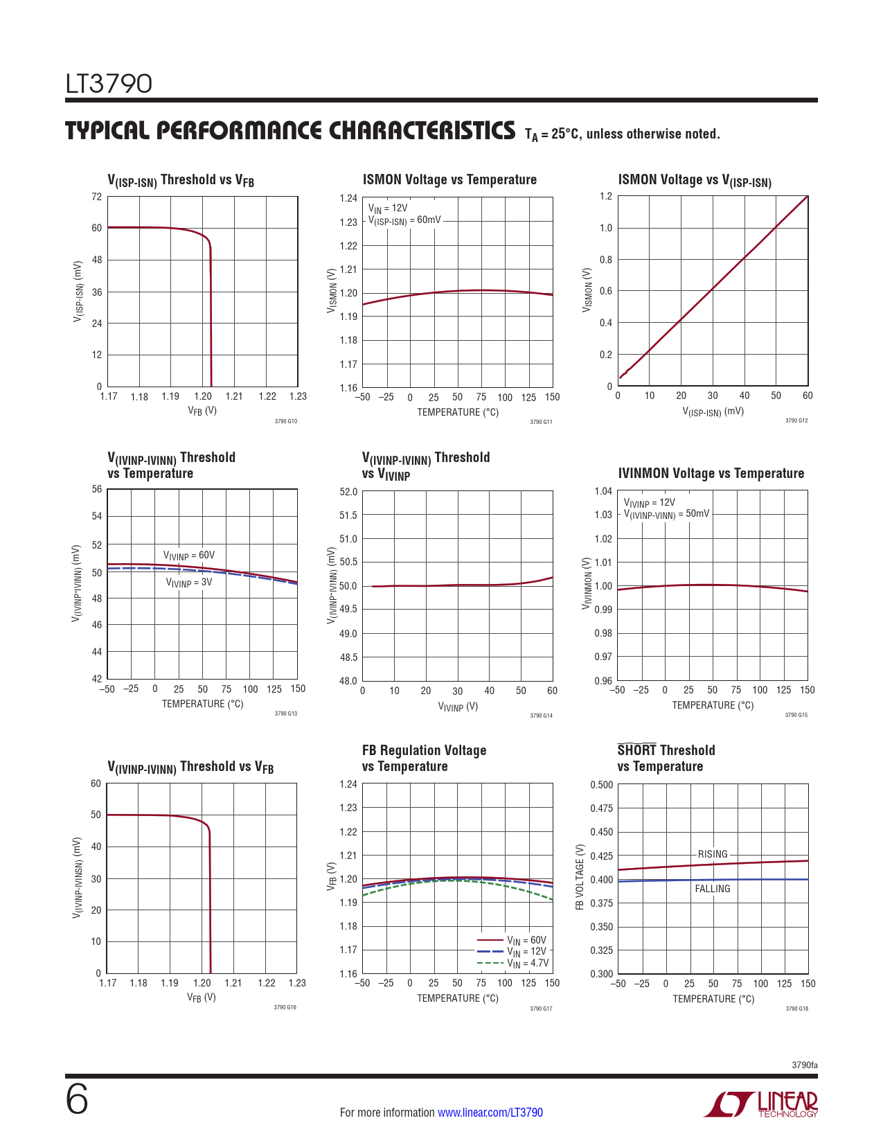 72 1.24 1.2 VIN = 12V V 60 1.23 (ISP-ISN) = 60mV 1.0 1.22 48 0.8 1.21 (mV) (V) (V) 36 1.20 0.6 V ISMON V ISMON V (ISP-ISN) 1.19 24 0.4 1.18 12 0.2 1.17 0 1.16 0 1.17 1.18 1.19 1.20 1.21 1.22 1.23 –50 –25 0 25 50 75 100 125 150 0 10 20 30 40 50 60 VFB (V) TEMPERATURE (°C) V(ISP-ISN) (mV) 3790 G10 3790 G11 3790 G12