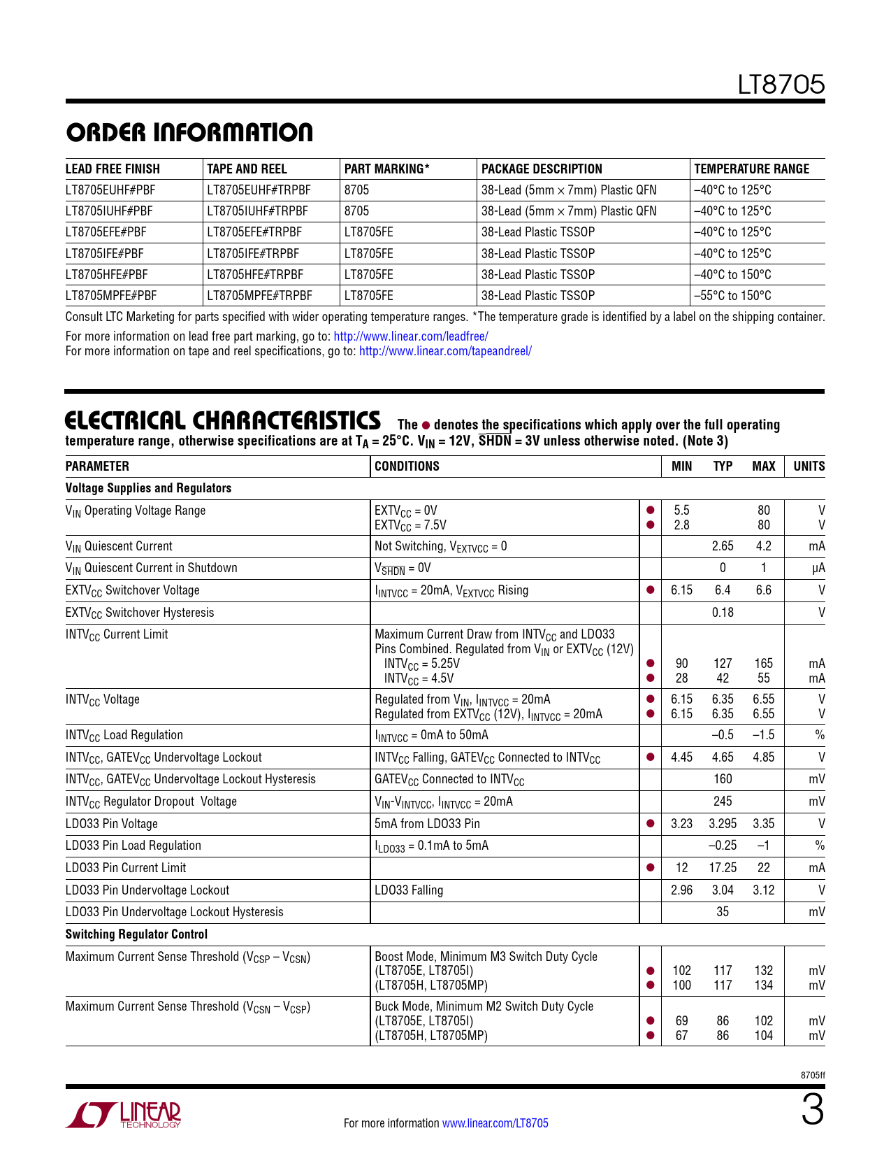 LT8705EUHF#PBF LT8705EUHF#TRPBF 8705 38-Lead (5mm × 7mm) Plastic QFN –40°C to 125°C LT8705IUHF#PBF LT8705IUHF#TRPBF 8705 38-Lead (5mm × 7mm) Plastic QFN –40°C to 125°C LT8705EFE#PBF LT8705EFE#TRPBF LT8705FE 38-Lead Plastic TSSOP –40°C to 125°C LT8705IFE#PBF LT8705IFE#TRPBF LT8705FE 38-Lead Plastic TSSOP –40°C to 125°C LT8705HFE#PBF LT8705HFE#TRPBF LT8705FE 38-Lead Plastic TSSOP –40°C to 150°C LT8705MPFE#PBF LT8705MPFE#TRPBF LT8705FE 38-Lead Plastic TSSOP –55°C to 150°C Consult LTC Marketing for parts specified with wider operating temperature ranges. *The temperature grade is identified by a label on the shipping container. For more information on lead free part marking, go to: http://www.linear.com/leadfree/ For more information on tape and reel specifications, go to: http://www.linear.com/tapeandreel/