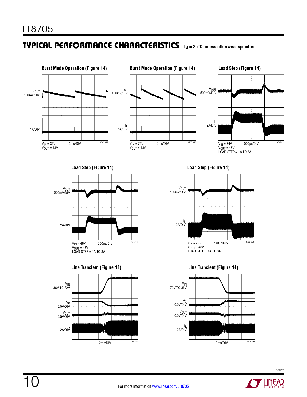 LT8705 Typical perForMance characTerisTics TA = 25°C unless otherwise specified.Burst Mode Operation (Figure 14)Burst Mode Operation (Figure 14)Load Step (Figure 14) V VOUT VOUT OUT 100mV/DIV 100mV/DIV 500mV/DIV IL IL IL 2A/DIV 1A/DIV 5A/DIV V 8705 G27 8705 G28 8705 G29 IN = 36V 2ms/DIV VIN = 72V 5ms/DIV VIN = 36V 500µs/DIV VOUT = 48V VOUT = 48V VOUT = 48V LOAD STEP = 1A TO 3A Load Step (Figure 14)Load Step (Figure 14) VOUT VOUT 500mV/DIV 500mV/DIV IL IL 2A/DIV 2A/DIV V 8705 G30 8705 G31 IN = 48V 500µs/DIV VIN = 72V 500µs/DIV VOUT = 48V VOUT = 48V LOAD STEP = 1A TO 3A LOAD STEP = 1A TO 3A Line Transient (Figure 14)Line Transient (Figure 14) VIN VIN 36V TO 72V 72V TO 36V V V C C 0.5V/DIV 0.5V/DIV V V OUT OUT 0.5V/DIV 0.5V/DIV IL IL 2A/DIV 2A/DIV 2ms/DIV 8705 G32 2ms/DIV 8705 G33 8705ff 10 For more information www.linear.com/LT8705 Document Outline Features Description Applications Typical Application Absolute Maximum Ratings Pin Configuration Order Information Electrical Characteristics Typical Performance Characteristics Pin Functions Block Diagram Operation Applications Information Typical Applications Package Description Revision History Typical Application Related Parts