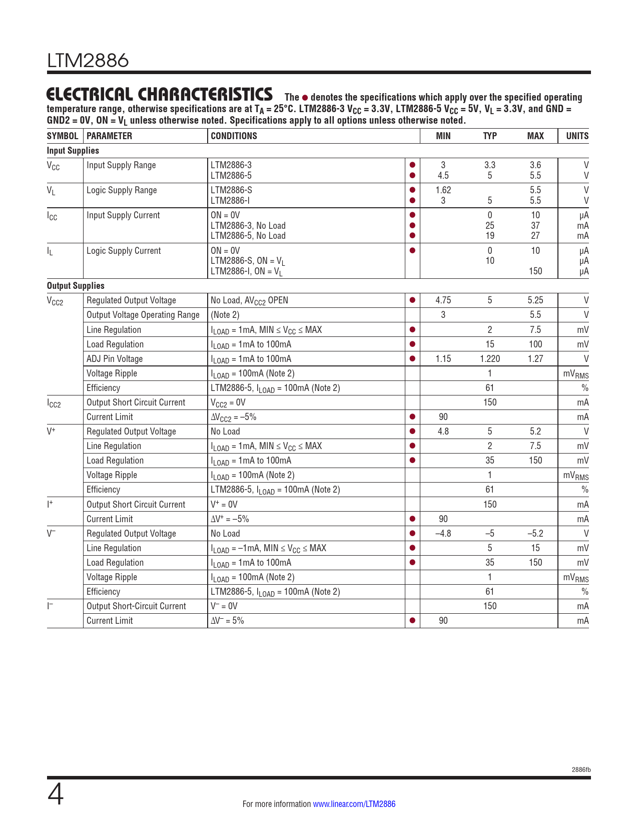 denotes the specifications which apply over the specified operating temperature range, otherwise specifications are at TA = 25°C. LTM2886-3 VCC = 3.3V, LTM2886-5 VCC = 5V, VL = 3.3V, and GND = GND2 = 0V, ON = VL unless otherwise noted. Specifications apply to all options unless otherwise noted. SYMBOL PARAMETER CONDITIONS MIN TYP MAX UNITS Input Supplies