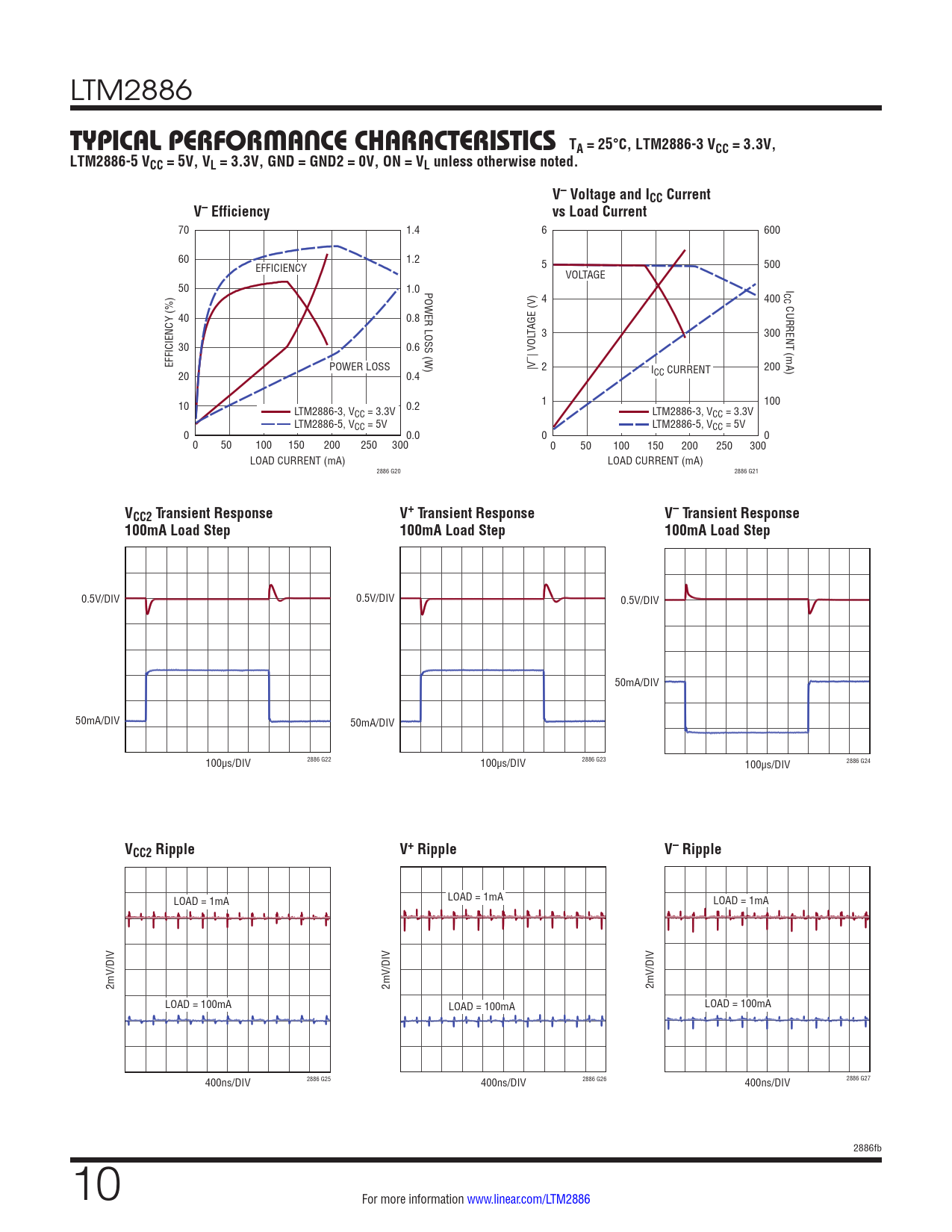 TYPICAL PERFORMANCE CHARACTERISTICS TA = 25°C, LTM2886-3 VCC = 3.3V, LTM2886-5 VCC = 5V, VL = 3.3V, GND = GND2 = 0V, ON = VL unless otherwise noted. V– Voltage and ICC Current V– Efficiency vs Load Current