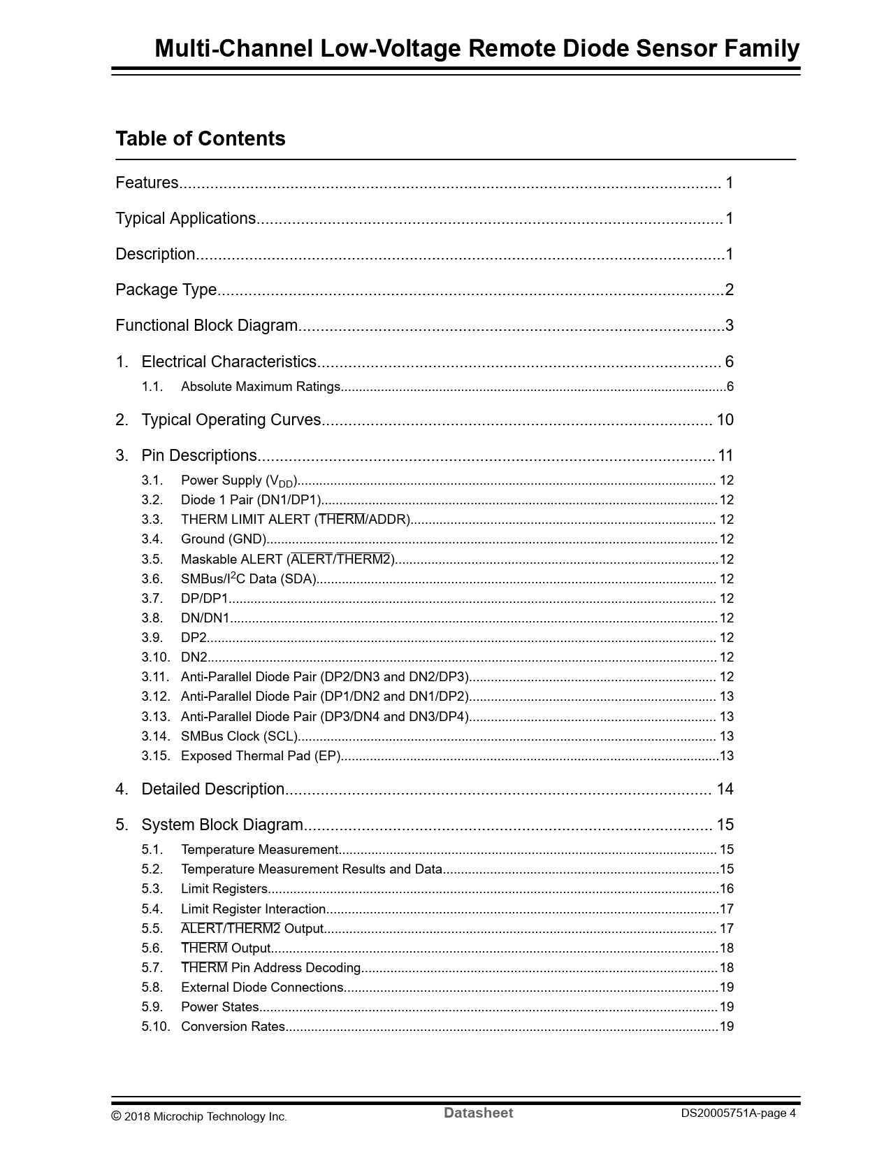 Features.. 1 Typical Applications...1 Description...1 Package Type..2 Functional Block Diagram..3 1. Electrical Characteristics... 6 1.1. Absolute Maximum Ratings..6 2. Typical Operating Curves.. 10 3. Pin Descriptions...11 3.1. Power Supply (VDD)... 12 3.2. Diode 1 Pair (DN1/DP1)... 12 3.3. THERM LIMIT ALERT (THERM/ADDR).. 12 3.4. Ground (GND).. 12 3.5. Maskable ALERT (ALERT/THERM2)...12 3.6. SMBus/I2C Data (SDA).. 12 3.7. DP/DP1.. 12 3.8. DN/DN1.. 12 3.9. DP2.. 12 3.10. DN2.. 12 3.11. Anti-Parallel Diode Pair (DP2/DN3 and DN2/DP3).. 12 3.12. Anti-Parallel Diode Pair (DP1/DN2 and DN1/DP2).. 13 3.13. Anti-Parallel Diode Pair (DP3/DN4 and DN3/DP4).. 13 3.14. SMBus Clock (SCL)... 13 3.15. Exposed Thermal Pad (EP)..13 4. Detailed Description.. 14 5. System Block Diagram.. 15 5.1. Temperature Measurement.. 15 5.2. Temperature Measurement Results and Data..15 5.3. Limit Registers..16 5.4. Limit Register Interaction..17 5.5. ALERT/THERM2 Output.. 17 5.6. THERM Output...18 5.7. THERM Pin Address Decoding.. 18 5.8. External Diode Connections...19 5.9. Power States.. 19 5.10. Conversion Rates...19 © 2018 Microchip Technology Inc.