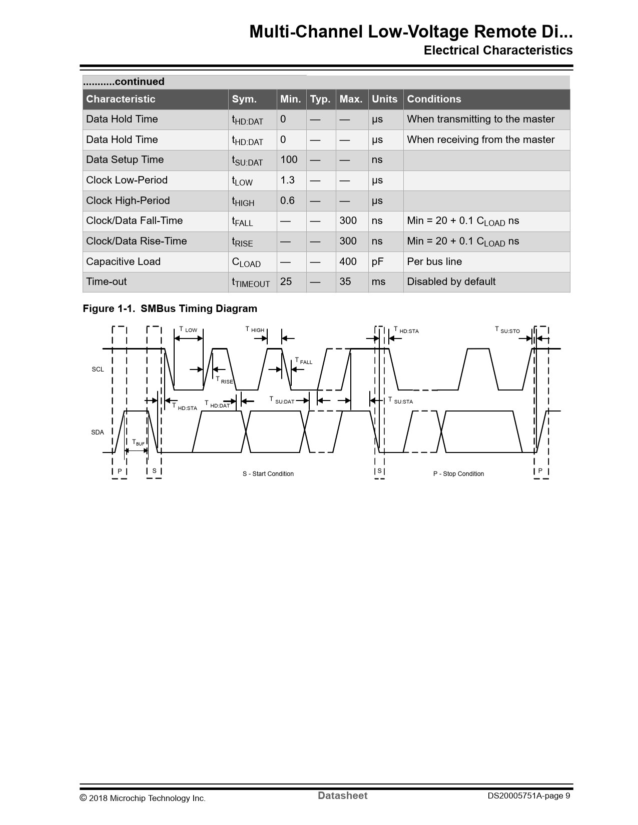 Data Hold Time tHD:DAT 0 — — µs When transmitting to the master Data Hold Time tHD:DAT 0 — — µs When receiving from the master Data Setup Time tSU:DAT 100 — — ns Clock Low-Period tLOW 1.3 — — µs Clock High-Period tHIGH 0.6 — — µs Clock/Data Fall-Time tFALL — — 300 ns Min = 20 + 0.1 CLOAD ns Clock/Data Rise-Time tRISE — — 300 ns Min = 20 + 0.1 CLOAD ns Capacitive Load CLOAD — — 400 pF Per bus line Time-out tTIMEOUT 25 — 35 ms Disabled by default