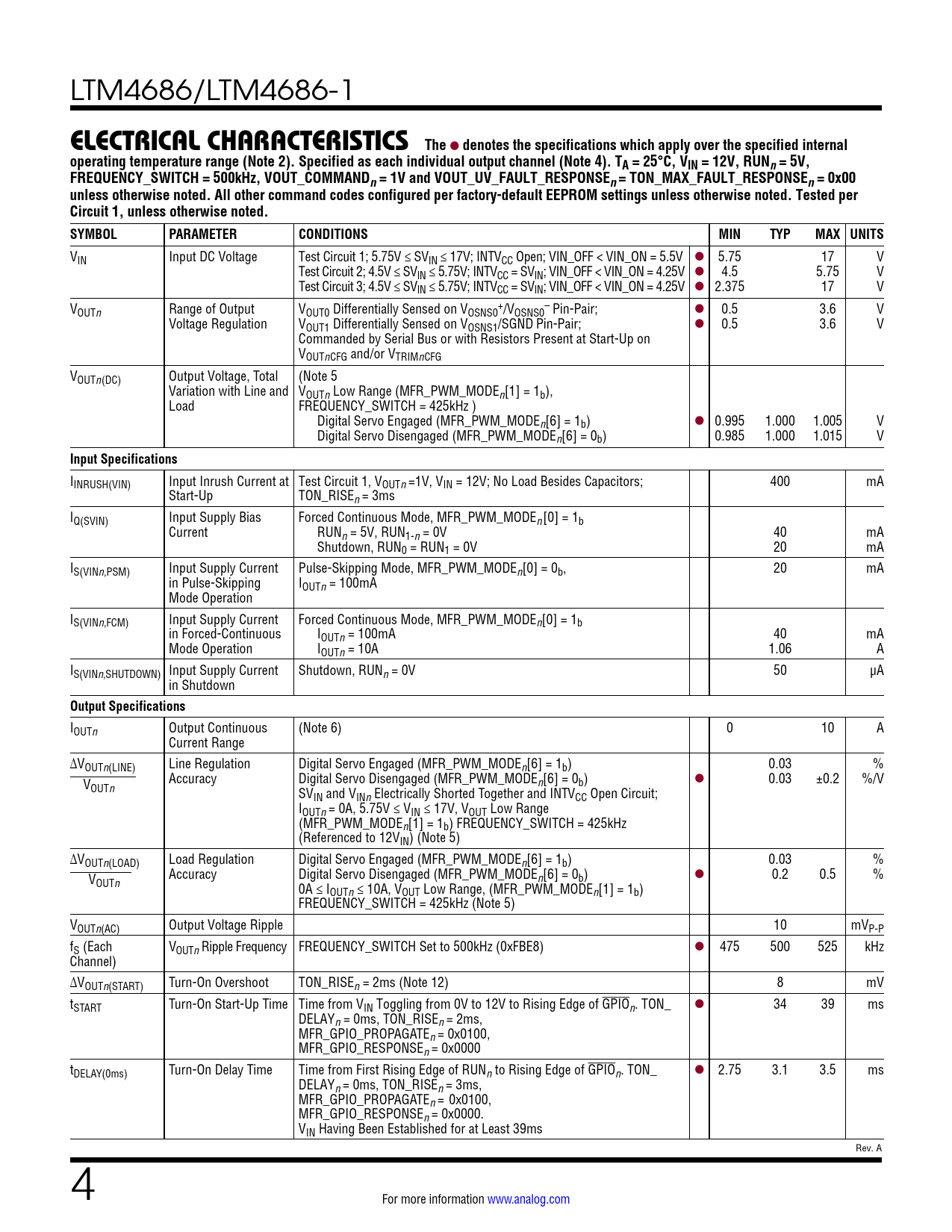 denotes the specifications which apply over the specified internal operating temperature range (Note 2). Specified as each individual output channel (Note 4). TA = 25°C, VIN = 12V, RUNn = 5V, FREQUENCY_SWITCH = 500kHz, VOUT_COMMANDn = 1V and VOUT_UV_FAULT_RESPONSEn = TON_MAX_FAULT_RESPONSEn = 0x00 unless otherwise noted. All other command codes configured per factory-default EEPROM settings unless otherwise noted. Tested per Circuit 1, unless otherwise noted. SYMBOL PARAMETER CONDITIONS MIN TYP MAX UNITS