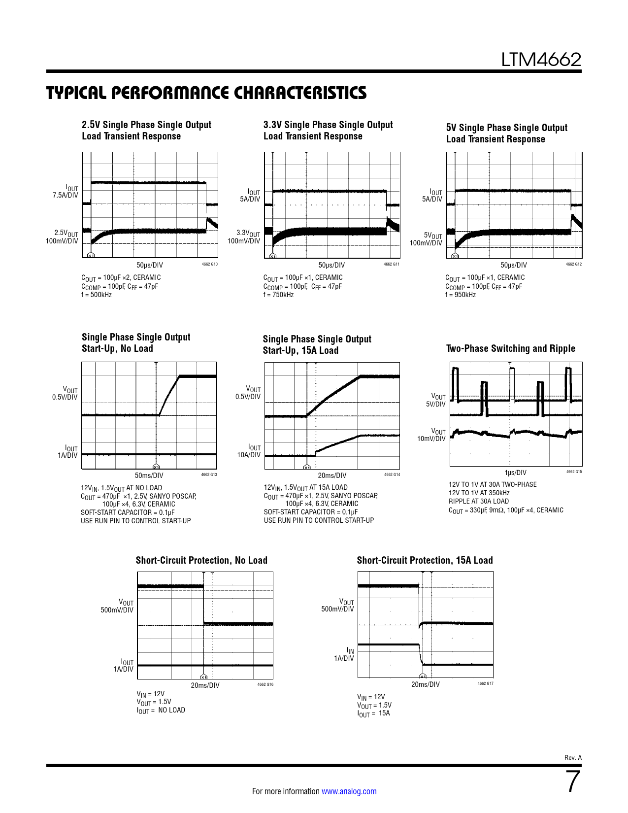 IOUT 7.5A/DIV IOUT IOUT 5A/DIV 5A/DIV 2.5VOUT 3.3VOUT 5V 100mV/DIV 100mV/DIV OUT 100mV/DIV 50µs/DIV 4662 G10 50µs/DIV 4662 G11 50µs/DIV 4662 G12 COUT = 100µF ×2, CERAMIC COUT = 100µF ×1, CERAMIC COUT = 100µF ×1, CERAMIC CCOMP = 100pF, CFF = 47pF CCOMP = 100pF, CFF = 47pF CCOMP = 100pF, CFF = 47pF f = 500kHz f = 750kHz f = 950kHz