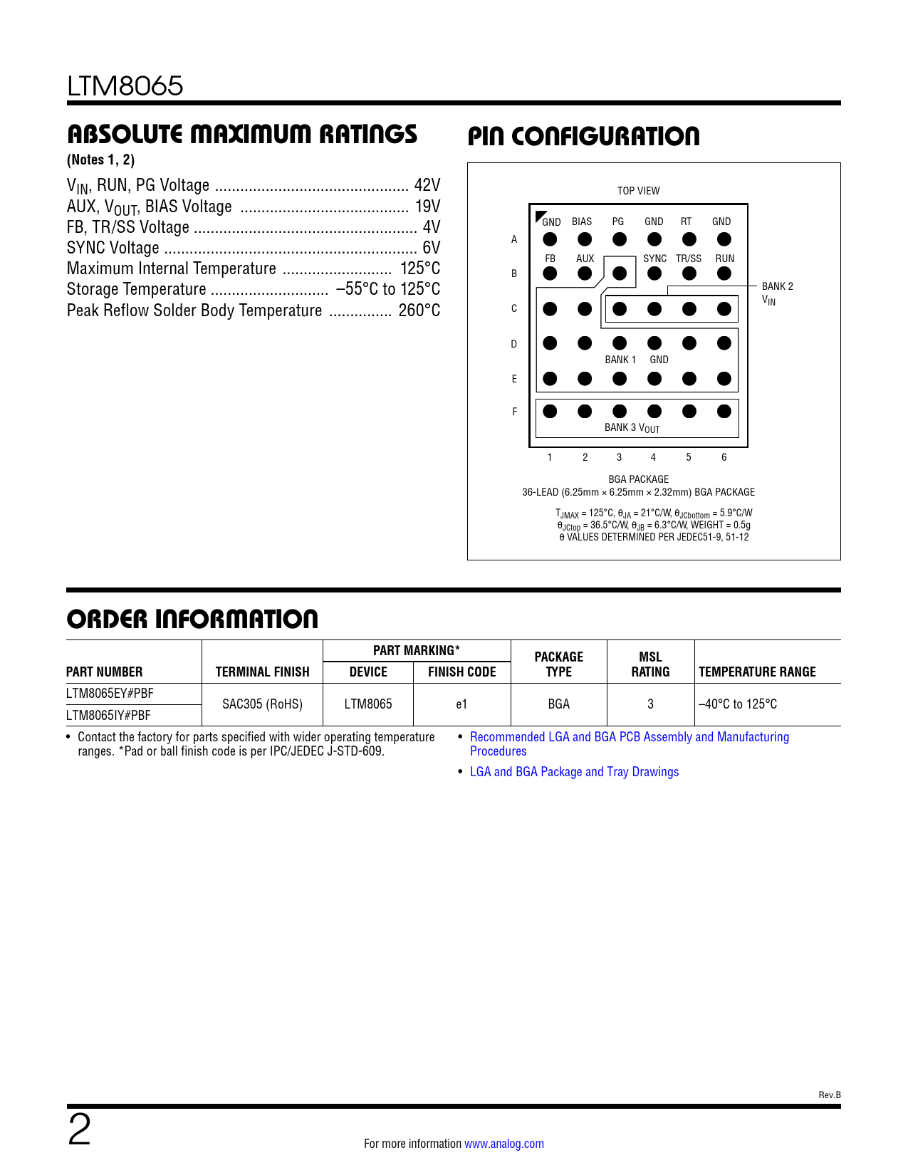 LTM8065EY#PBF SAC305 (RoHS) LTM8065 e1 BGA 3 –40°C to 125°C LTM8065IY#PBF • Contact the factory for parts specified with wider operating temperature • Recommended LGA and BGA PCB Assembly and Manufacturing ranges. *Pad or ball finish code is per IPC/JEDEC J-STD-609. Procedures • LGA and BGA Package and Tray Drawings Rev.B 2 For more information www.analog.com