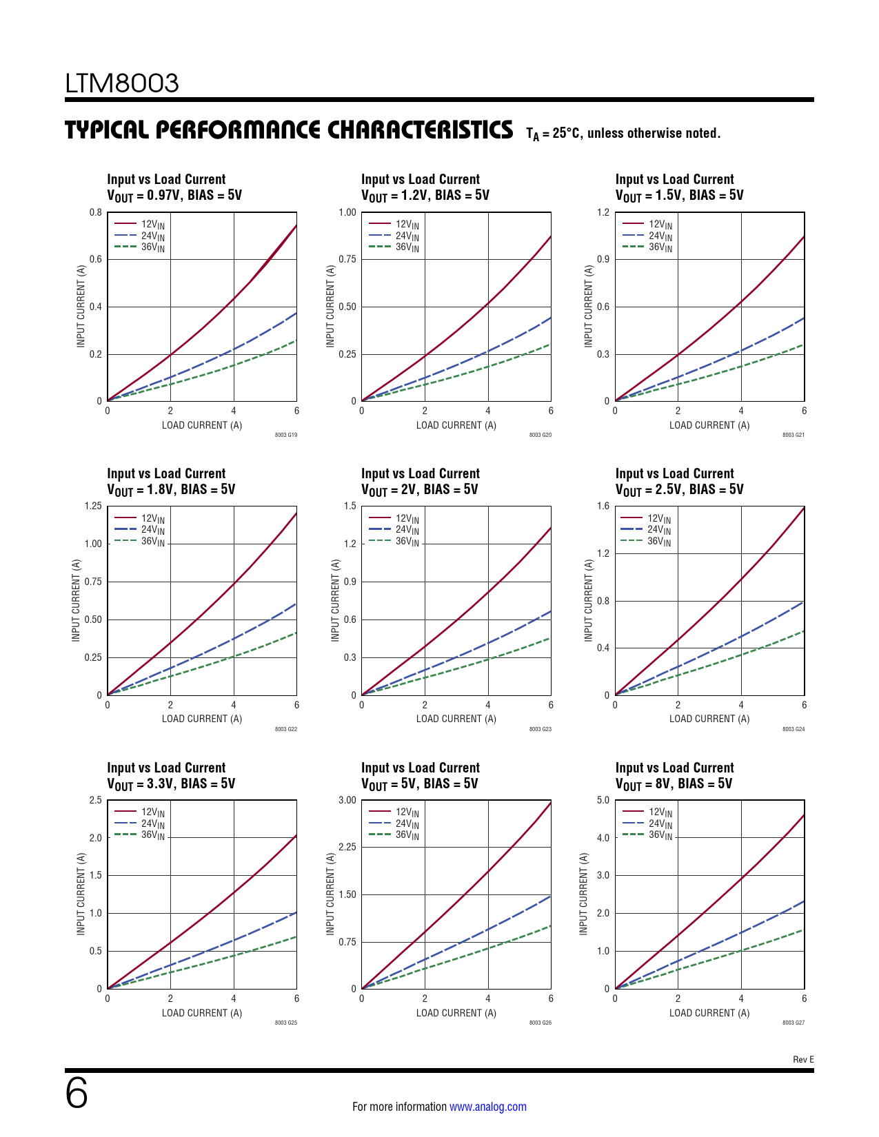 0.8 1.00 1.2 12VIN 12VIN 12VIN 24VIN 24VIN 24VIN 36VIN 36VIN 36VIN 0.6 0.75 0.9 0.4 0.50 0.6 INPUT CURRENT (A) INPUT CURRENT (A) INPUT CURRENT (A) 0.2 0.25 0.3 0 0 0 0 2 4 6 0 2 4 6 0 2 4 6 LOAD CURRENT (A) LOAD CURRENT (A) LOAD CURRENT (A) 8003 G19 8003 G20 8003 G21