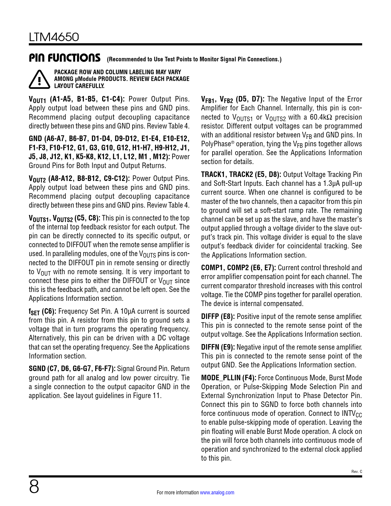 PIN FUNCTIONS (Recommended to Use Test Points to Monitor Signal Pin Connections.) PACKAGE ROW AND COLUMN LABELING MAY VARY AMONG µModule PRODUCTS. REVIEW EACH PACKAGE LAYOUT CAREFULLY. VOUT1 (A1-A5, B1-B5, C1-C4):