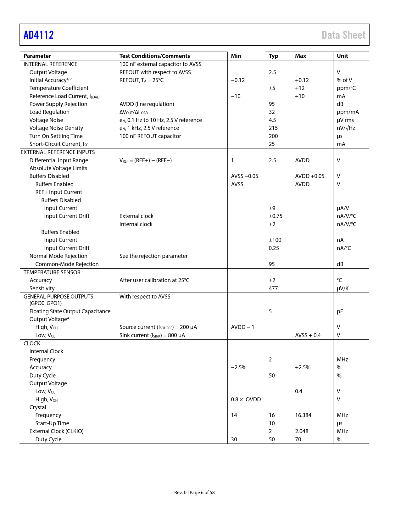 | 页数 / 页 | 58 / 6 — AD4112. Data Sheet. Parameter. Test Conditions/Comments. Min. Typ. Max. … |
