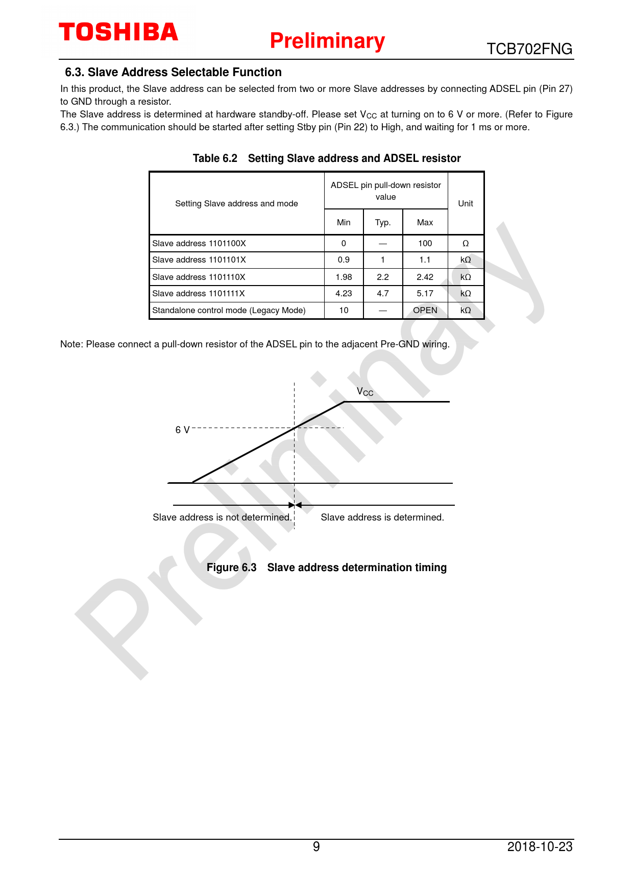 ADSEL pin pull-down resistor value Setting Slave address and mode Unit Min Typ. Max Slave address 1101100X 0 ― 100 Ω Slave address 1101101X 0.9 1 1.1 kΩ Slave address 1101110X 1.98 2.2 2.42 kΩ Slave address 1101111X 4.23 4.7 5.17 kΩ Standalone control mode (Legacy Mode) 10 ― OPEN kΩ Note: Please connect a pull-down resistor of the ADSEL pin to the adjacent Pre-GND wiring. VCC 6 V Slave address is not determined. Slave address is determined.