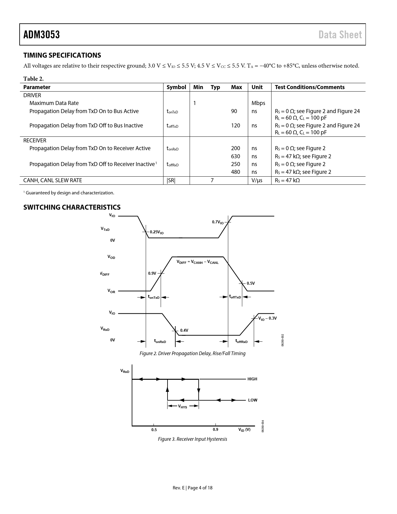 页数 / 页18 / 4 — ADM3053. Data Sheet. TIMING SPECIFICATIONS. Table 2. Parameter. Symbol …
