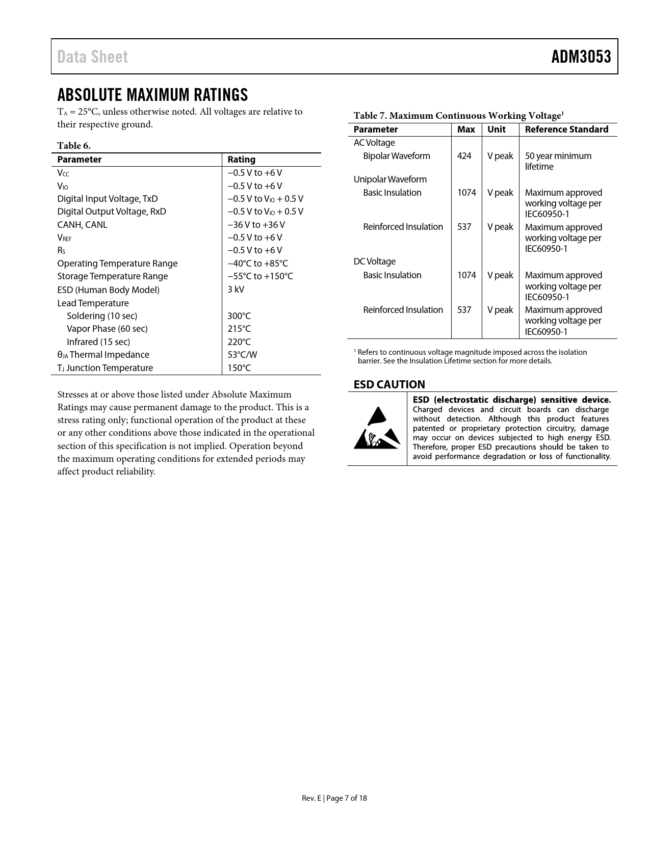 Data Sheet. ADM3053. ABSOLUTE MAXIMUM RATINGS. Table 7. Maximum Continuous Working Voltage1. Parameter. Max Unit