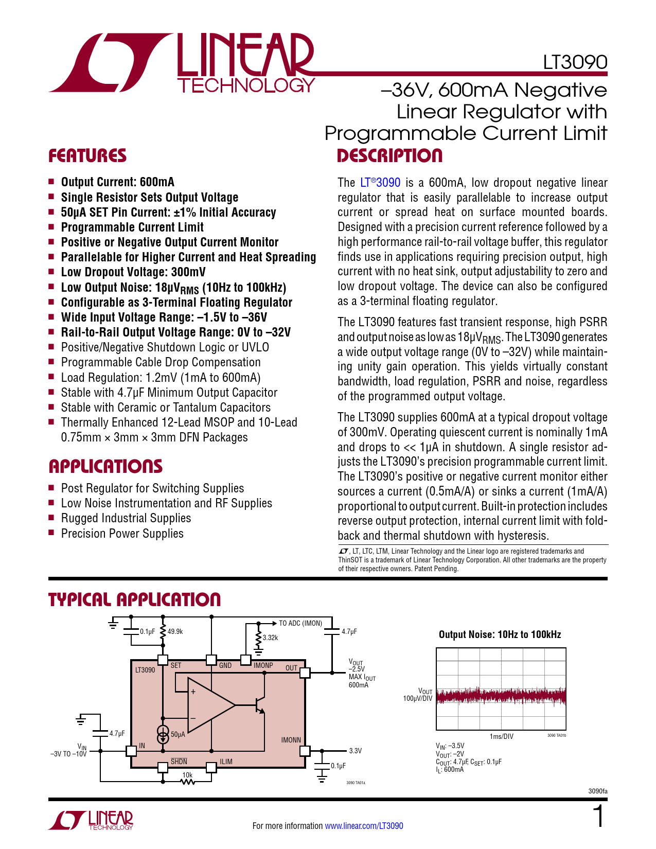 LT3090 –36V, 600mA Negative Linear Regulator with Programmable Current Limit FeaTuresDescripTion n Output Current: 600mA The LT®3090 is a 600mA, low dropout negative linear n Single Resistor Sets Output Voltage regulator that is easily parallelable to increase output n 50µA SET Pin Current: ±1% Initial Accuracy current or spread heat on surface mounted boards. n Programmable Current Limit Designed with a precision current reference followed by a n Positive or Negative Output Current Monitor high performance rail-to-rail voltage buffer, this regulator n Parallelable for Higher Current and Heat Spreading finds use in applications requiring precision output, high n Low Dropout Voltage: 300mV current with no heat sink, output adjustability to zero and n Low Output Noise: 18µV low dropout voltage. The device can also be configured RMS (10Hz to 100kHz) n Configurable as 3-Terminal Floating Regulator as a 3-terminal floating regulator. n Wide Input Voltage Range: –1.5V to –36V The LT3090 features fast transient response, high PSRR n Rail-to-Rail Output Voltage Range: 0V to –32V and output noise as low as 18µVRMS. The LT3090 generates n Positive/Negative Shutdown Logic or UVLO a wide output voltage range (0V to –32V) while maintain- n Programmable Cable Drop Compensation ing unity gain operation. This yields virtually constant n Load Regulation: 1.2mV (1mA to 600mA) bandwidth, load regulation, PSRR and noise, regardless n Stable with 4.7µF Minimum Output Capacitor of the programmed output voltage. n Stable with Ceramic or Tantalum Capacitors n The LT3090 supplies 600mA at a typical dropout voltage Thermally Enhanced 12-Lead MSOP and 10-Lead of 300mV. Operating quiescent current is nominally 1mA 0.75mm × 3mm × 3mm DFN Packages and drops to << 1µA in shutdown. A single resistor ad- justs the LT3090’s precision programmable current limit. applicaTions The LT3090’s positive or negative current monitor either n Post Regulator for Switching Supplies sources a current (0.5mA/A) or sinks a current (1mA/A) n Low Noise Instrumentation and RF Supplies proportional to output current. Built-in protection includes n Rugged Industrial Supplies reverse output protection, internal current limit with fold- n Precision Power Supplies back and thermal shutdown with hysteresis. L, LT, LTC, LTM, Linear Technology and the Linear logo are registered trademarks and ThinSOT is a trademark of Linear Technology Corporation. All other trademarks are the property of their respective owners. Patent Pending. Typical applicaTion TO ADC (IMON) 0.1µF 49.9k 4.7µF 3.32k Output Noise: 10Hz to 100kHz VOUT SET GND IMONP LT3090 OUT –2.5V MAX IOUT 600mA + VOUT 100µV/DIV – 4.7µF 50µA 1ms/DIV 3090 TA01b IMONN V IN IN VIN: –3.5V –3V TO –10V 3.3V VOUT: –2V SHDN ILIM COUT: 4.7µF, CSET: 0.1µF 0.1µF IL: 600mA 10k 3090 TA01a 3090fa For more information www.linear.com/LT3090 1