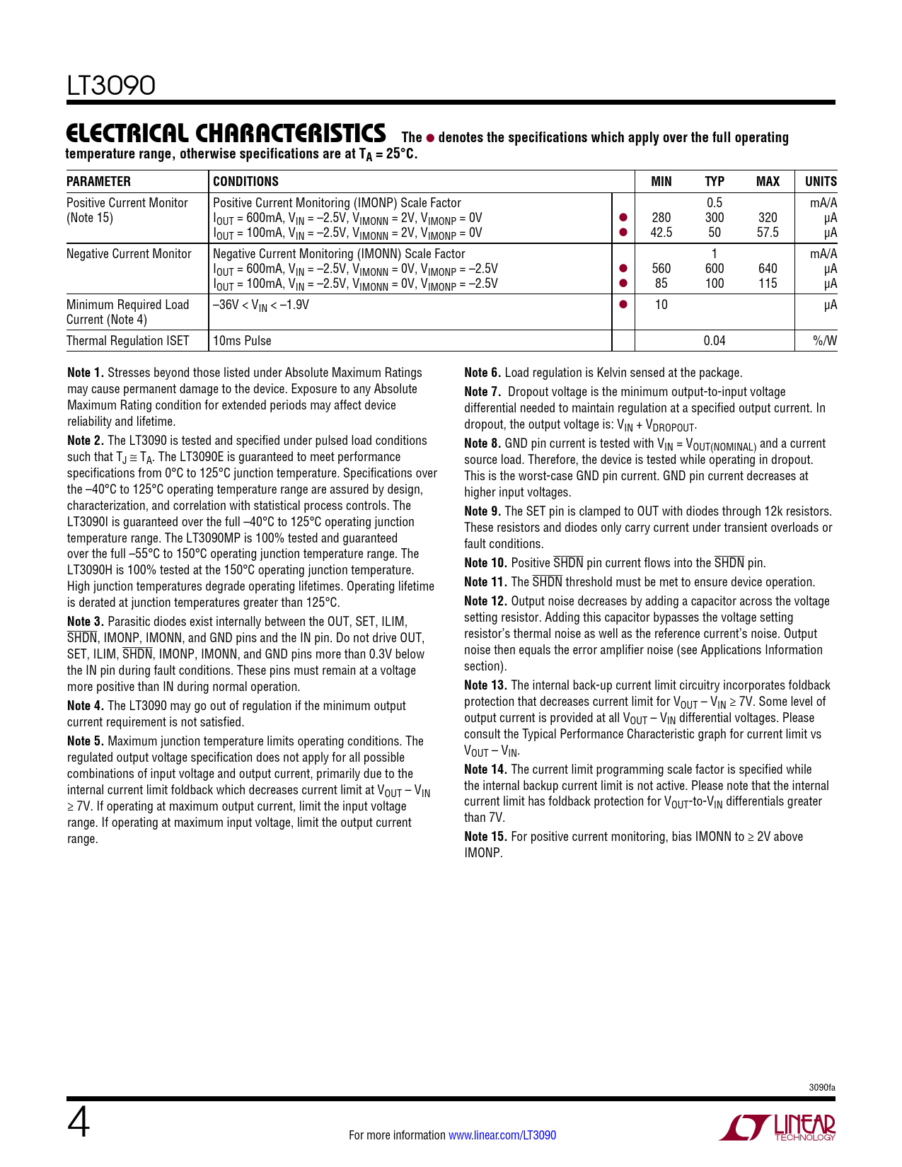 For positive current monitoring, bias IMONN to ≥ 2V above IMONP. 3090fa 4 For more information www.linear.com/LT3090
