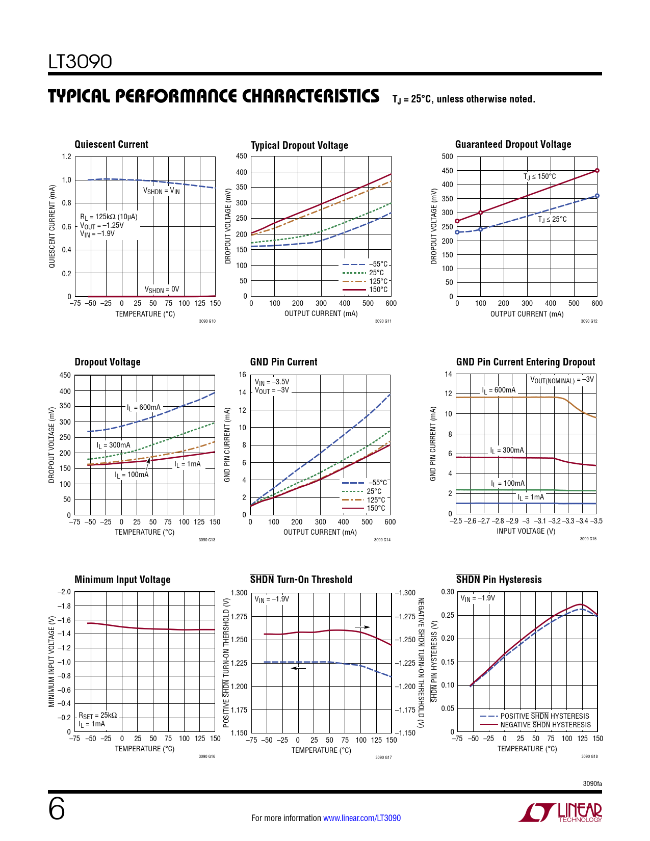 1.2 450 500 400 450 1.0 TJ ≤ 150°C 400 V 350 SHDN = VIN 0.8 300 350 R 300 L = 125kΩ (10µA) TAGE (mV) 250 TAGE (mV) TJ ≤ 25°C 0.6 VOUT = –1.25V 250 VIN = –1.9V 200 200 0.4 150 150 QUIESCENT CURRENT (mA) DROPOUT VOL 100 –55°C DROPOUT VOL 100 0.2 25°C 50 125°C 50 VSHDN = 0V 150°C 0 0 0 –75 –50 –25 0 25 50 75 100 125 150 0 100 200 300 400 500 600 0 100 200 300 400 500 600 TEMPERATURE (°C) OUTPUT CURRENT (mA) OUTPUT CURRENT (mA) 3090 G10 3090 G11 3090 G12