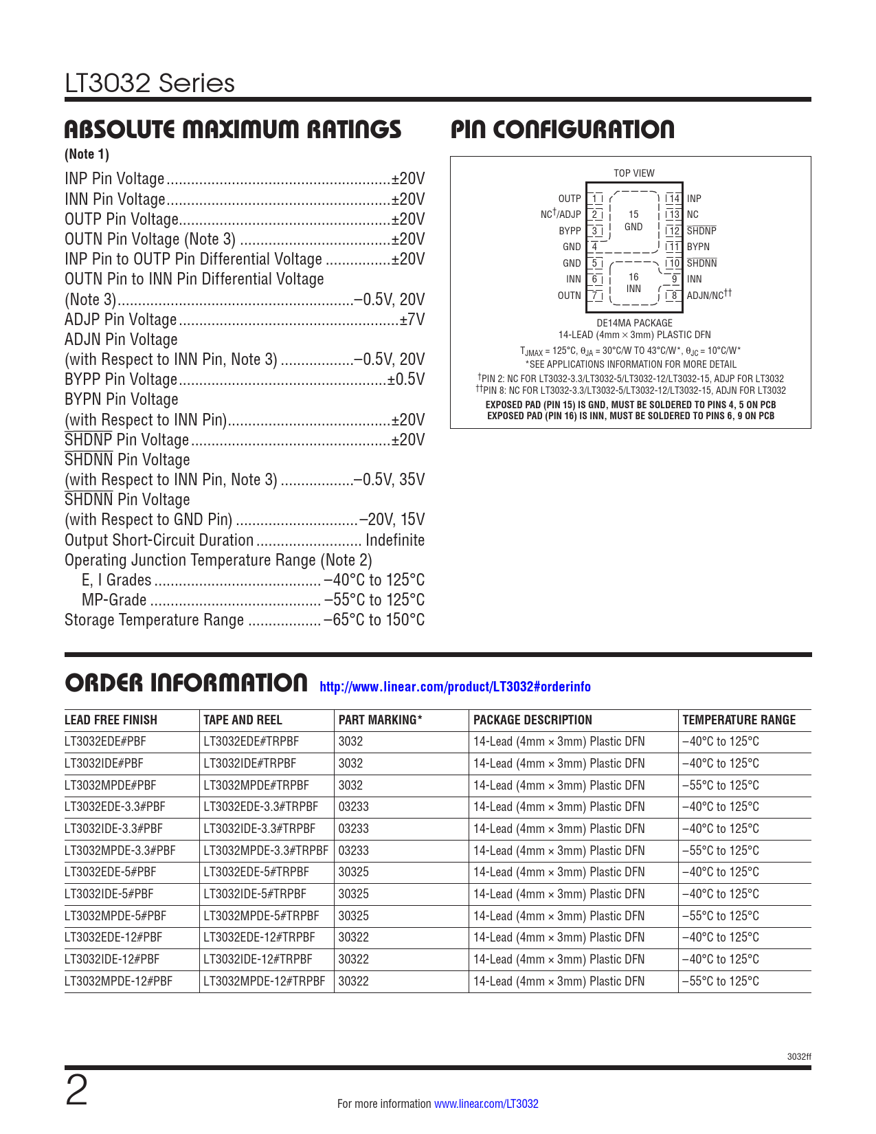 ORDER INFORMATION http://www.linear.com/product/LT3032#orderinfo LEAD FREE FINISH TAPE AND REEL PART MARKING* PACKAGE DESCRIPTION TEMPERATURE RANGE