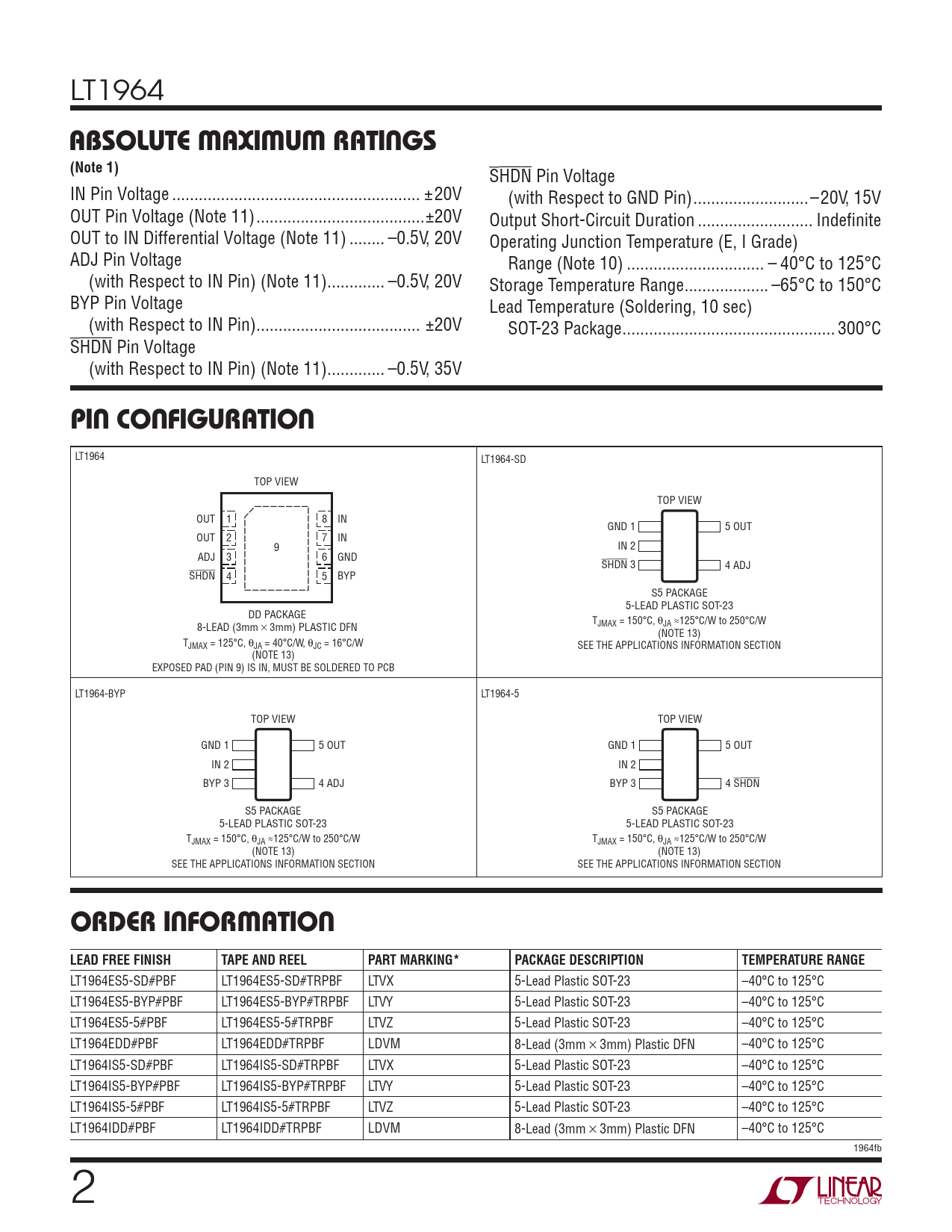 LT1964 ABSOLUTE MAXIMUM RATINGS(Note 1) SHDN Pin Voltage IN Pin Voltage .. ±20V (with Respect to GND Pin) ..–20V, 15V OUT Pin Voltage (Note 11) ..±20V Output Short-Circuit Duration .. Indefi nite OUT to IN Differential Voltage (Note 11) .. –0.5V, 20V Operating Junction Temperature (E, I Grade) ADJ Pin Voltage Range (Note 10) ... – 40°C to 125°C (with Respect to IN Pin) (Note 11) ... –0.5V, 20V Storage Temperature Range ... –65°C to 150°C BYP Pin Voltage Lead Temperature (Soldering, 10 sec) (with Respect to IN Pin) ... ±20V SOT-23 Package .. 300°C SHDN Pin Voltage (with Respect to IN Pin) (Note 11) ... –0.5V, 35V PIN CONFIGURATION LT1964 LT1964-SD TOP VIEW TOP VIEW OUT 1 8 IN GND 1 5 OUT OUT 2 7 IN 9 IN 2 ADJ 3 6 GND SHDN 3 4 ADJ SHDN 4 5 BYP S5 PACKAGE 5-LEAD PLASTIC SOT-23 DD PACKAGE T 8-LEAD (3mm s 3mm) PLASTIC DFN JMAX = 150°C, θJA ≈125°C/W to 250°C/W (NOTE 13) TJMAX = 125°C, θJA = 40°C/W, θJC = 16°C/W SEE THE APPLICATIONS INFORMATION SECTION (NOTE 13) EXPOSED PAD (PIN 9) IS IN, MUST BE SOLDERED TO PCB LT1964-BYP LT1964-5 TOP VIEW TOP VIEW GND 1 5 OUT GND 1 5 OUT IN 2 IN 2 BYP 3 4 ADJ BYP 3 4 SHDN S5 PACKAGE S5 PACKAGE 5-LEAD PLASTIC SOT-23 5-LEAD PLASTIC SOT-23 TJMAX = 150°C, θJA ≈125°C/W to 250°C/W TJMAX = 150°C, θJA ≈125°C/W to 250°C/W (NOTE 13) (NOTE 13) SEE THE APPLICATIONS INFORMATION SECTION SEE THE APPLICATIONS INFORMATION SECTION ORDER INFORMATIONLEAD FREE FINISHTAPE AND REELPART MARKING*PACKAGE DESCRIPTIONTEMPERATURE RANGE LT1964ES5-SD#PBF LT1964ES5-SD#TRPBF LTVX 5-Lead Plastic SOT-23 –40°C to 125°C LT1964ES5-BYP#PBF LT1964ES5-BYP#TRPBF LTVY 5-Lead Plastic SOT-23 –40°C to 125°C LT1964ES5-5#PBF LT1964ES5-5#TRPBF LTVZ 5-Lead Plastic SOT-23 –40°C to 125°C LT1964EDD#PBF LT1964EDD#TRPBF LDVM 8-Lead (3mm × 3mm) Plastic DFN –40°C to 125°C LT1964IS5-SD#PBF LT1964IS5-SD#TRPBF LTVX 5-Lead Plastic SOT-23 –40°C to 125°C LT1964IS5-BYP#PBF LT1964IS5-BYP#TRPBF LTVY 5-Lead Plastic SOT-23 –40°C to 125°C LT1964IS5-5#PBF LT1964IS5-5#TRPBF LTVZ 5-Lead Plastic SOT-23 –40°C to 125°C LT1964IDD#PBF LT1964IDD#TRPBF LDVM 8-Lead (3mm × 3mm) Plastic DFN –40°C to 125°C 1964fb 2