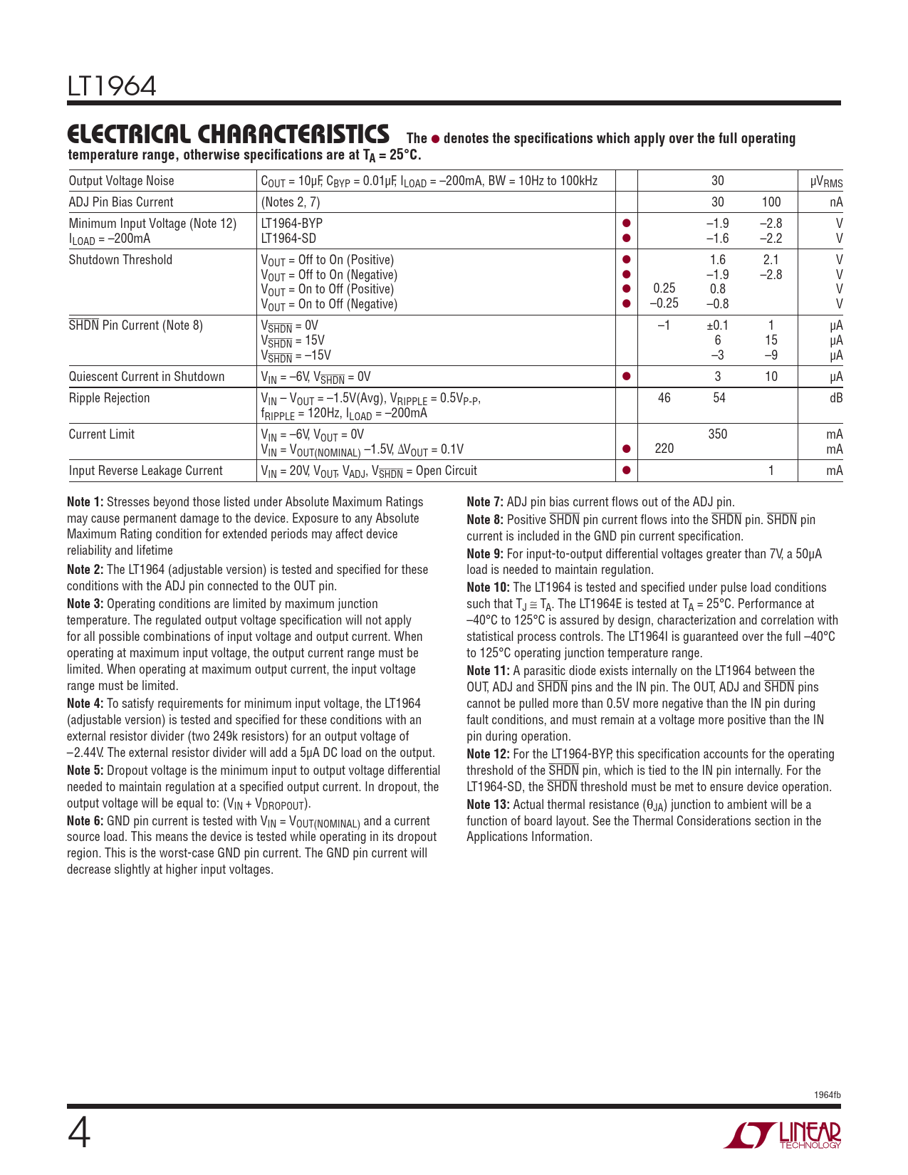 LT1964 ELECTRICAL CHARACTERISTICSThe l denotes the specifi cations which apply over the full operatingtemperature range, otherwise specifi cations are at TA = 25°C. Output Voltage Noise COUT = 10μF, CBYP = 0.01μF, ILOAD = –200mA, BW = 10Hz to 100kHz 30 μVRMS ADJ Pin Bias Current (Notes 2, 7) 30 100 nA Minimum Input Voltage (Note 12) LT1964-BYP l –1.9 –2.8 V ILOAD = –200mA LT1964-SD l –1.6 –2.2 V Shutdown Threshold VOUT = Off to On (Positive) l 1.6 2.1 V VOUT = Off to On (Negative) l –1.9 –2.8 V VOUT = On to Off (Positive) l 0.25 0.8 V VOUT = On to Off (Negative) l –0.25 –0.8 V SHDN Pin Current (Note 8) VSHDN = 0V –1 ±0.1 1 μA VSHDN = 15V 6 15 μA VSHDN = –15V –3 –9 μA Quiescent Current in Shutdown VIN = –6V, VSHDN = 0V l 3 10 μA Ripple Rejection VIN – VOUT = –1.5V(Avg), VRIPPLE = 0.5VP-P, 46 54 dB fRIPPLE = 120Hz, ILOAD = –200mA Current Limit VIN = –6V, VOUT = 0V 350 mA VIN = VOUT(NOMINAL) –1.5V, ΔVOUT = 0.1V l 220 mA Input Reverse Leakage Current VIN = 20V, VOUT, VADJ, VSHDN = Open Circuit l 1 mA Note 1: Stresses beyond those listed under Absolute Maximum Ratings Note 7: ADJ pin bias current fl ows out of the ADJ pin. may cause permanent damage to the device. Exposure to any Absolute Note 8: Positive SHDN pin current fl ows into the SHDN pin. SHDN pin Maximum Rating condition for extended periods may affect device current is included in the GND pin current specifi cation. reliability and lifetime Note 9: For input-to-output differential voltages greater than 7V, a 50μA Note 2: The LT1964 (adjustable version) is tested and specifi ed for these load is needed to maintain regulation. conditions with the ADJ pin connected to the OUT pin. Note 10: The LT1964 is tested and specifi ed under pulse load conditions Note 3: Operating conditions are limited by maximum junction such that TJ ≅ TA. The LT1964E is tested at TA = 25°C. Performance at temperature. The regulated output voltage specifi cation will not apply –40°C to 125°C is assured by design, characterization and correlation with for all possible combinations of input voltage and output current. When statistical process controls. The LT1964I is guaranteed over the full –40°C operating at maximum input voltage, the output current range must be to 125°C operating junction temperature range. limited. When operating at maximum output current, the input voltage Note 11: A parasitic diode exists internally on the LT1964 between the range must be limited. OUT, ADJ and SHDN pins and the IN pin. The OUT, ADJ and SHDN pins Note 4: To satisfy requirements for minimum input voltage, the LT1964 cannot be pulled more than 0.5V more negative than the IN pin during (adjustable version) is tested and specifi ed for these conditions with an fault conditions, and must remain at a voltage more positive than the IN external resistor divider (two 249k resistors) for an output voltage of pin during operation. –2.44V. The external resistor divider will add a 5μA DC load on the output. Note 12: For the LT1964-BYP, this specifi cation accounts for the operating Note 5: Dropout voltage is the minimum input to output voltage differential threshold of the SHDN pin, which is tied to the IN pin internally. For the needed to maintain regulation at a specifi ed output current. In dropout, the LT1964-SD, the SHDN threshold must be met to ensure device operation. output voltage will be equal to: (VIN + VDROPOUT). Note 13: Actual thermal resistance (θJA) junction to ambient will be a Note 6: GND pin current is tested with VIN = VOUT(NOMINAL) and a current function of board layout. See the Thermal Considerations section in the source load. This means the device is tested while operating in its dropout Applications Information. region. This is the worst-case GND pin current. The GND pin current will decrease slightly at higher input voltages. 1964fb 4