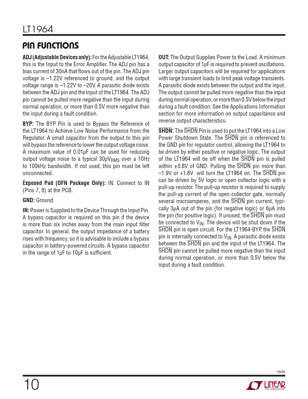 Power is Supplied to the Device Through the Input Pin. cally 3μA out of the pin (for negative logic) or 6μA into A bypass capacitor is required on this pin if the device the pin (for positive logic). If unused, the SHDN pin must is more than six inches away from the main input fi lter be connected to VIN. The device will be shut down if the capacitor. In general, the output impedance of a battery SHDN pin is open circuit. For the LT1964-BYP, the SHDN rises with frequency, so it is advisable to include a bypass pin is internally connected to VIN. A parasitic diode exists capacitor in battery-powered circuits. A bypass capacitor between the SHDN pin and the input of the LT1964. The in the range of 1μF to 10μF is suffi cient. SHDN pin cannot be pulled more negative than the input during normal operation, or more than 0.5V below the input during a fault condition. 1964fb 10