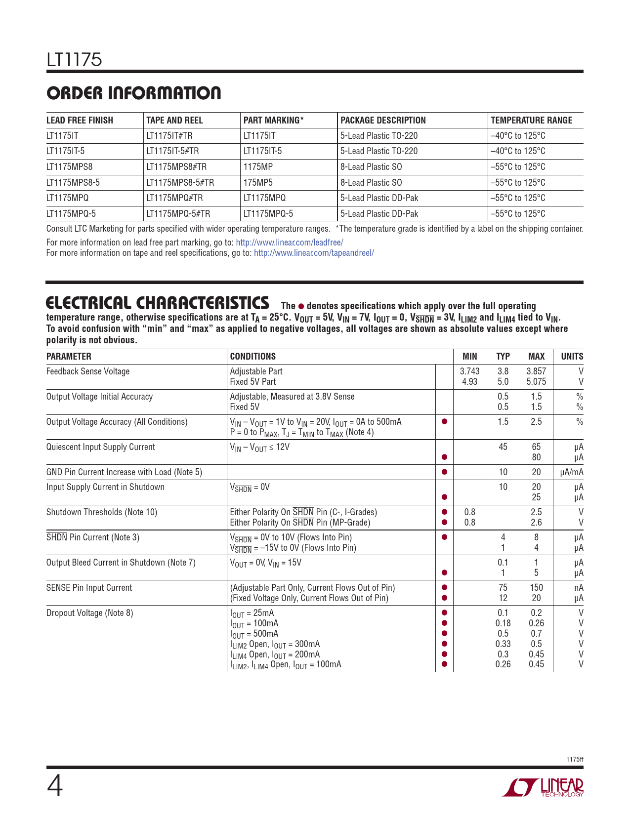 LT1175 ORDER INFORMATIONLEAD FREE FINISHTAPE AND REELPART MARKING*PACKAGE DESCRIPTIONTEMPERATURE RANGE LT1175IT LT1175IT#TR LT1175IT 5-Lead Plastic TO-220 –40°C to 125°C LT1175IT-5 LT1175IT-5#TR LT1175IT-5 5-Lead Plastic TO-220 –40°C to 125°C LT1175MPS8 LT1175MPS8#TR 1175MP 8-Lead Plastic SO –55°C to 125°C LT1175MPS8-5 LT1175MPS8-5#TR 175MP5 8-Lead Plastic SO –55°C to 125°C LT1175MPQ LT1175MPQ#TR LT1175MPQ 5-Lead Plastic DD-Pak –55°C to 125°C LT1175MPQ-5 LT1175MPQ-5#TR LT1175MPQ-5 5-Lead Plastic DD-Pak –55°C to 125°C Consult LTC Marketing for parts specifi ed with wider operating temperature ranges. *The temperature grade is identifi ed by a label on the shipping container. For more information on lead free part marking, go to: http://www.linear.com/leadfree/ For more information on tape and reel specifi cations, go to: http://www.linear.com/tapeandreel/ ELECTRICAL CHARACTERISTICSThe l denotes specifi cations which apply over the full operatingtemperature range, otherwise specifi cations are at TA = 25°C. VOUT = 5V, VIN = 7V, IOUT = 0, VSHDN = 3V, ILIM2 and ILIM4 tied to VIN.To avoid confusion with “min” and “max” as applied to negative voltages, all voltages are shown as absolute values except where polarity is not obvious.PARAMETERCONDITIONSMINTYPMAXUNITS Feedback Sense Voltage Adjustable Part 3.743 3.8 3.857 V Fixed 5V Part 4.93 5.0 5.075 V Output Voltage Initial Accuracy Adjustable, Measured at 3.8V Sense 0.5 1.5 % Fixed 5V 0.5 1.5 % Output Voltage Accuracy (All Conditions) VIN – VOUT = 1V to VIN = 20V, IOUT = 0A to 500mA l 1.5 2.5 % P = 0 to PMAX, TJ = TMIN to TMAX (Note 4) Quiescent Input Supply Current VIN – VOUT ≤ 12V 45 65 μA l 80 μA GND Pin Current Increase with Load (Note 5) l 10 20 μA/mA Input Supply Current in Shutdown VSHDN = 0V 10 20 μA l 25 μA Shutdown Thresholds (Note 10) Either Polarity On SHDN Pin (C-, I-Grades) l 0.8 2.5 V Either Polarity On SHDN Pin (MP-Grade) l 0.8 2.6 V SHDN Pin Current (Note 3) VSHDN = 0V to 10V (Flows Into Pin) l 4 8 μA VSHDN = –15V to 0V (Flows Into Pin) 1 4 μA Output Bleed Current in Shutdown (Note 7) VOUT = 0V, VIN = 15V 0.1 1 μA l 1 5 μA SENSE Pin Input Current (Adjustable Part Only, Current Flows Out of Pin) l 75 150 nA (Fixed Voltage Only, Current Flows Out of Pin) l 12 20 μA Dropout Voltage (Note 8) IOUT = 25mA l 0.1 0.2 V IOUT = 100mA l 0.18 0.26 V IOUT = 500mA l 0.5 0.7 V ILIM2 Open, IOUT = 300mA l 0.33 0.5 V ILIM4 Open, IOUT = 200mA l 0.3 0.45 V ILIM2, ILIM4 Open, IOUT = 100mA l 0.26 0.45 V 1175ff 4