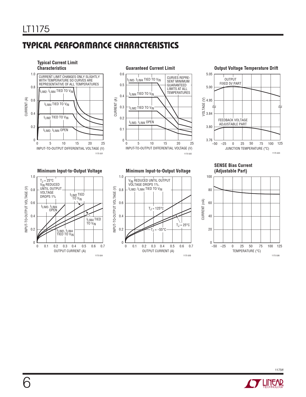 1.0 1.0 100 TJ = 25°C VIN REDUCED UNTIL OUTPUT VIN REDUCED VOLTAGE DROPS 1%. 0.8 UNTIL OUTPUT 0.8 ILIM2, ILIM4 TIED TO VIN 80 VOLTAGE I DROPS 1% LIM2 TIED TO VIN 0.6 0.6 60 ILIM2, ILIM4 T OPEN J = 125°C 0.4 0.4 40 ILIM4 TIED CURRENT (nA) TO VIN TJ = 25°C 0.2 0.2 T 20 INPUT-TO-OUTPUT VOLTAGE (V) ILIM2, ILIM4 INPUT-TO-OUTPUT VOLTAGE (V) J = –55°C TIED TO VIN 0 0 0 0 0.1 0.2 0.3 0.4 0.5 0.6 0.7 0 0.1 0.2 0.3 0.4 0.5 0.6 0.7 –50 –25 0 25 50 75 100 125 OUTPUT CURRENT (A) OUTPUT CURRENT (A) TEMPERATURE (°C) 1175 G04 1175 G05 1175 G06 1175ff 6