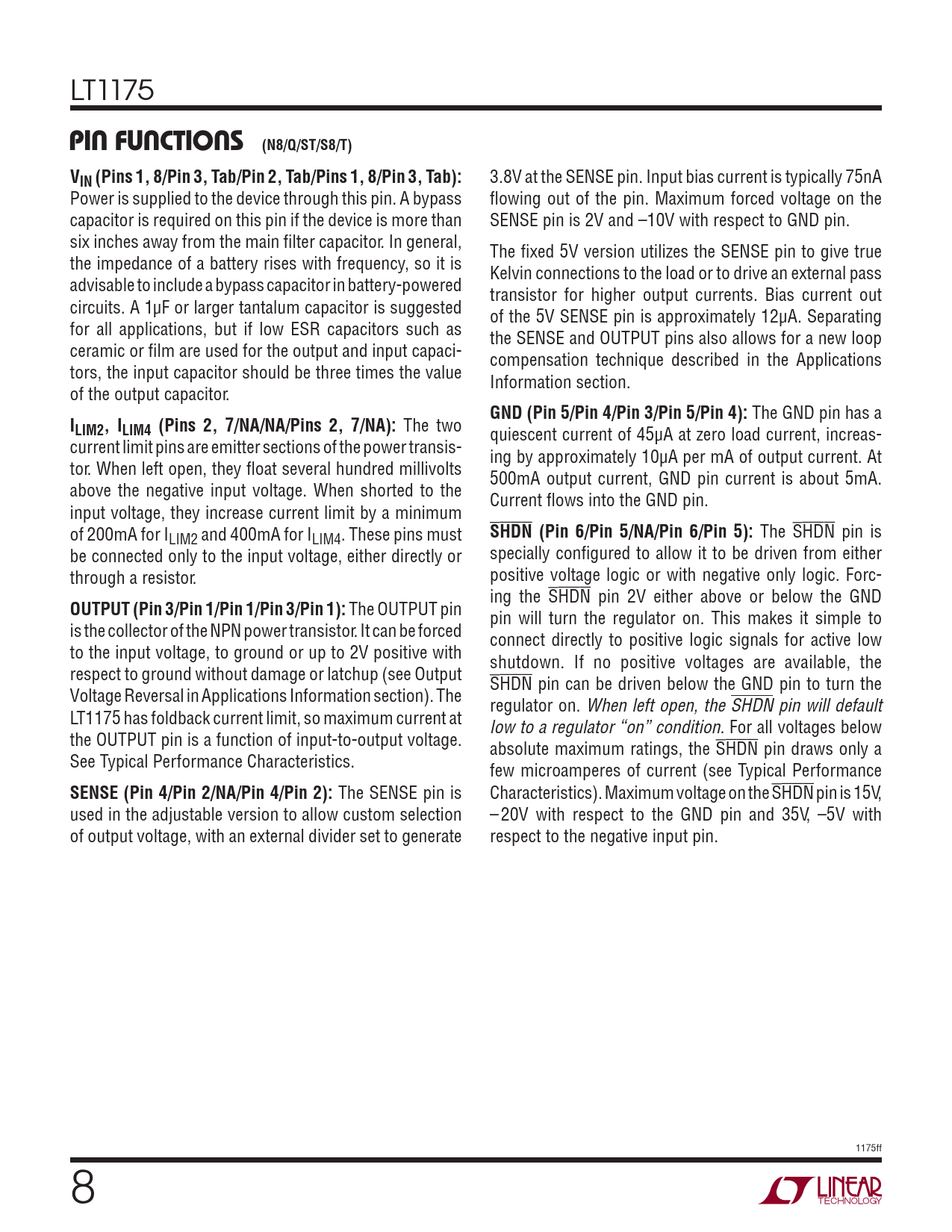 The SENSE pin is Characteristics). Maximum voltage on the SHDN pin is 15V, used in the adjustable version to allow custom selection – 20V with respect to the GND pin and 35V, –5V with of output voltage, with an external divider set to generate respect to the negative input pin. 1175ff 8