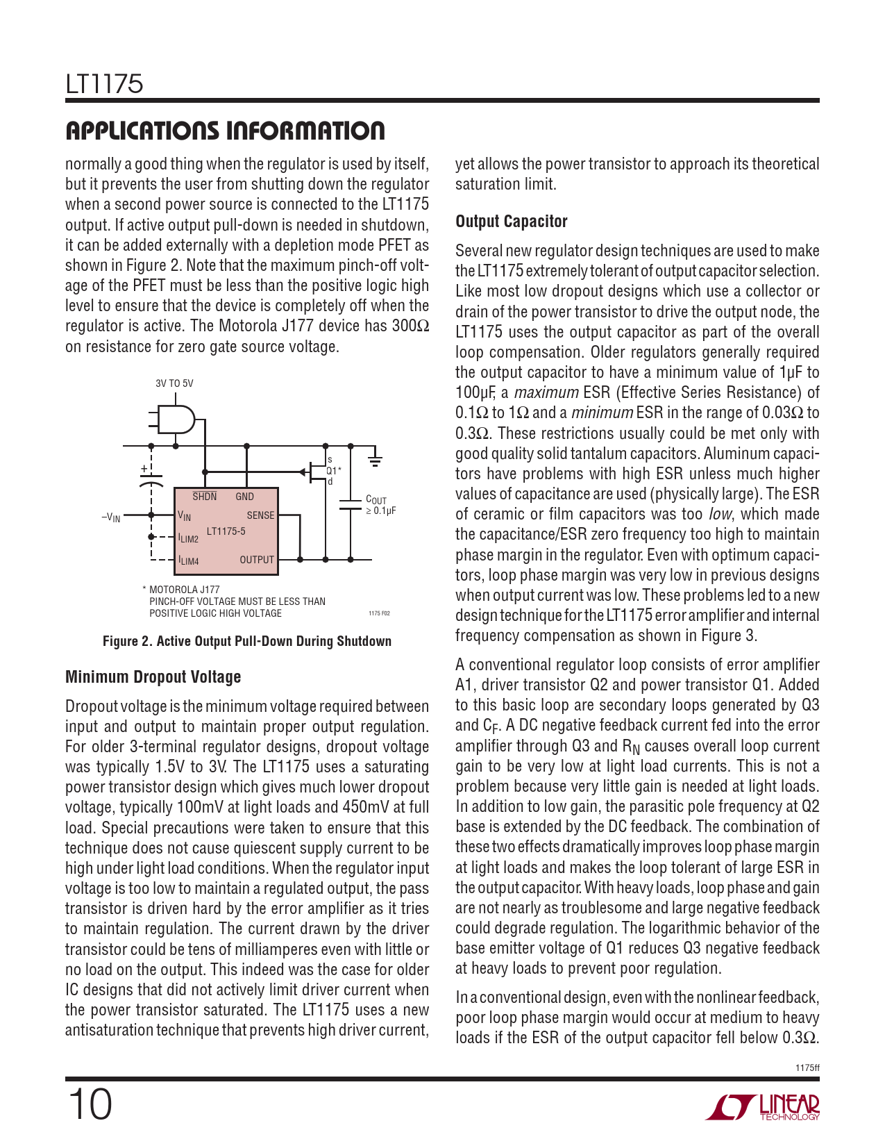 LT1175 APPLICATIONS INFORMATION normally a good thing when the regulator is used by itself, yet allows the power transistor to approach its theoretical but it prevents the user from shutting down the regulator saturation limit. when a second power source is connected to the LT1175 output. If active output pull-down is needed in shutdown, Output Capacitor it can be added externally with a depletion mode PFET as Several new regulator design techniques are used to make shown in Figure 2. Note that the maximum pinch-off volt- the LT1175 extremely tolerant of output capacitor selection. age of the PFET must be less than the positive logic high Like most low dropout designs which use a collector or level to ensure that the device is completely off when the drain of the power transistor to drive the output node, the regulator is active. The Motorola J177 device has 300Ω LT1175 uses the output capacitor as part of the overall on resistance for zero gate source voltage. loop compensation. Older regulators generally required the output capacitor to have a minimum value of 1μF to 3V TO 5V 100μF, a maximum ESR (Effective Series Resistance) of 0.1Ω to 1Ω and a minimum ESR in the range of 0.03Ω to 0.3Ω. These restrictions usually could be met only with s good quality solid tantalum capacitors. Aluminum capaci- + Q1* tors have problems with high ESR unless much higher d SHDN GND C values of capacitance are used (physically large). The ESR OUT ≥ 0.1μF –VIN VIN SENSE of ceramic or fi lm capacitors was too low, which made LT1175-5 ILIM2 the capacitance/ESR zero frequency too high to maintain ILIM4 OUTPUT phase margin in the regulator. Even with optimum capaci- tors, loop phase margin was very low in previous designs * MOTOROLA J177 when output current was low. These problems led to a new PINCH-OFF VOLTAGE MUST BE LESS THAN 1175 F02 POSITIVE LOGIC HIGH VOLTAGE design technique for the LT1175 error amplifi er and internal frequency compensation as shown in Figure 3. Figure 2. Active Output Pull-Down During Shutdown A conventional regulator loop consists of error amplifi er Minimum Dropout Voltage A1, driver transistor Q2 and power transistor Q1. Added Dropout voltage is the minimum voltage required between to this basic loop are secondary loops generated by Q3 input and output to maintain proper output regulation. and CF. A DC negative feedback current fed into the error For older 3-terminal regulator designs, dropout voltage amplifi er through Q3 and RN causes overall loop current was typically 1.5V to 3V. The LT1175 uses a saturating gain to be very low at light load currents. This is not a power transistor design which gives much lower dropout problem because very little gain is needed at light loads. voltage, typically 100mV at light loads and 450mV at full In addition to low gain, the parasitic pole frequency at Q2 load. Special precautions were taken to ensure that this base is extended by the DC feedback. The combination of technique does not cause quiescent supply current to be these two effects dramatically improves loop phase margin high under light load conditions. When the regulator input at light loads and makes the loop tolerant of large ESR in voltage is too low to maintain a regulated output, the pass the output capacitor. With heavy loads, loop phase and gain transistor is driven hard by the error amplifi er as it tries are not nearly as troublesome and large negative feedback to maintain regulation. The current drawn by the driver could degrade regulation. The logarithmic behavior of the transistor could be tens of milliamperes even with little or base emitter voltage of Q1 reduces Q3 negative feedback no load on the output. This indeed was the case for older at heavy loads to prevent poor regulation. IC designs that did not actively limit driver current when In a conventional design, even with the nonlinear feedback, the power transistor saturated. The LT1175 uses a new poor loop phase margin would occur at medium to heavy antisaturation technique that prevents high driver current, loads if the ESR of the output capacitor fell below 0.3Ω. 1175ff 10