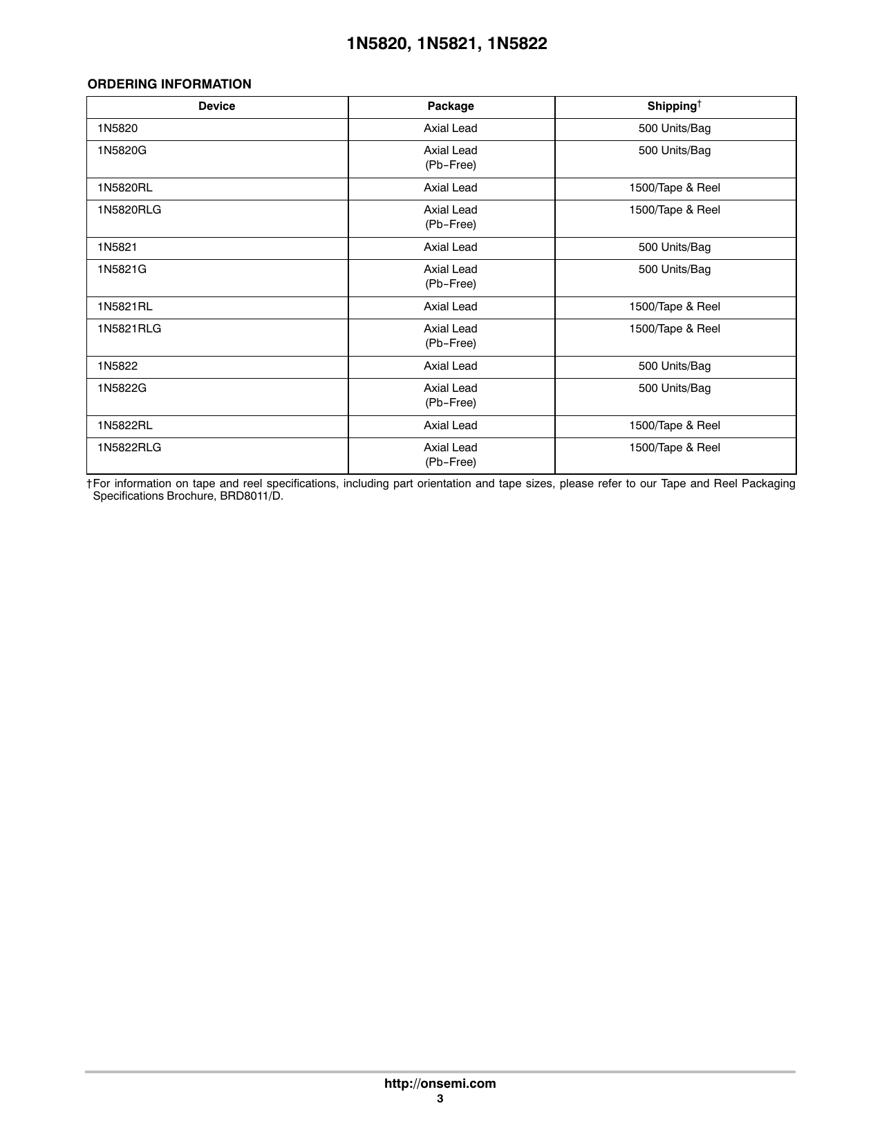 † 1N5820 Axial Lead 500 Units/Bag 1N5820G Axial Lead 500 Units/Bag (Pb-Free) 1N5820RL Axial Lead 1500/Tape & Reel 1N5820RLG Axial Lead 1500/Tape & Reel (Pb-Free) 1N5821 Axial Lead 500 Units/Bag 1N5821G Axial Lead 500 Units/Bag (Pb-Free) 1N5821RL Axial Lead 1500/Tape & Reel 1N5821RLG Axial Lead 1500/Tape & Reel (Pb-Free) 1N5822 Axial Lead 500 Units/Bag 1N5822G Axial Lead 500 Units/Bag (Pb-Free) 1N5822RL Axial Lead 1500/Tape & Reel 1N5822RLG Axial Lead 1500/Tape & Reel (Pb-Free) †For information on tape and reel specifications, including part orientation and tape sizes, please refer to our Tape and Reel Packaging Specifications Brochure, BRD8011/D.