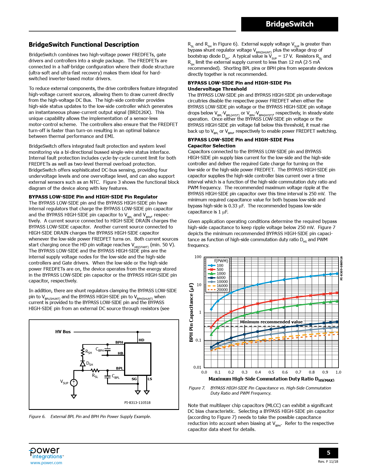 Figure 7. BYPASS HIGH-SIDE Pin Capacitance vs. High-Side Commutation Duty Ratio and PWM Frequency. PI-8313-110518 Note that multilayer chip capacitors (MLCC) can exhibit a significant DC bias characteristic. Selecting a BYPASS HIGH-SIDE pin capacitor Figure 6. External BPL Pin and BPH Pin Power Supply Example. (according to Figure 7) needs to take the possible capacitance reduction into account when biasing at V . Refer to the respective BPH capacitor data sheet for details.