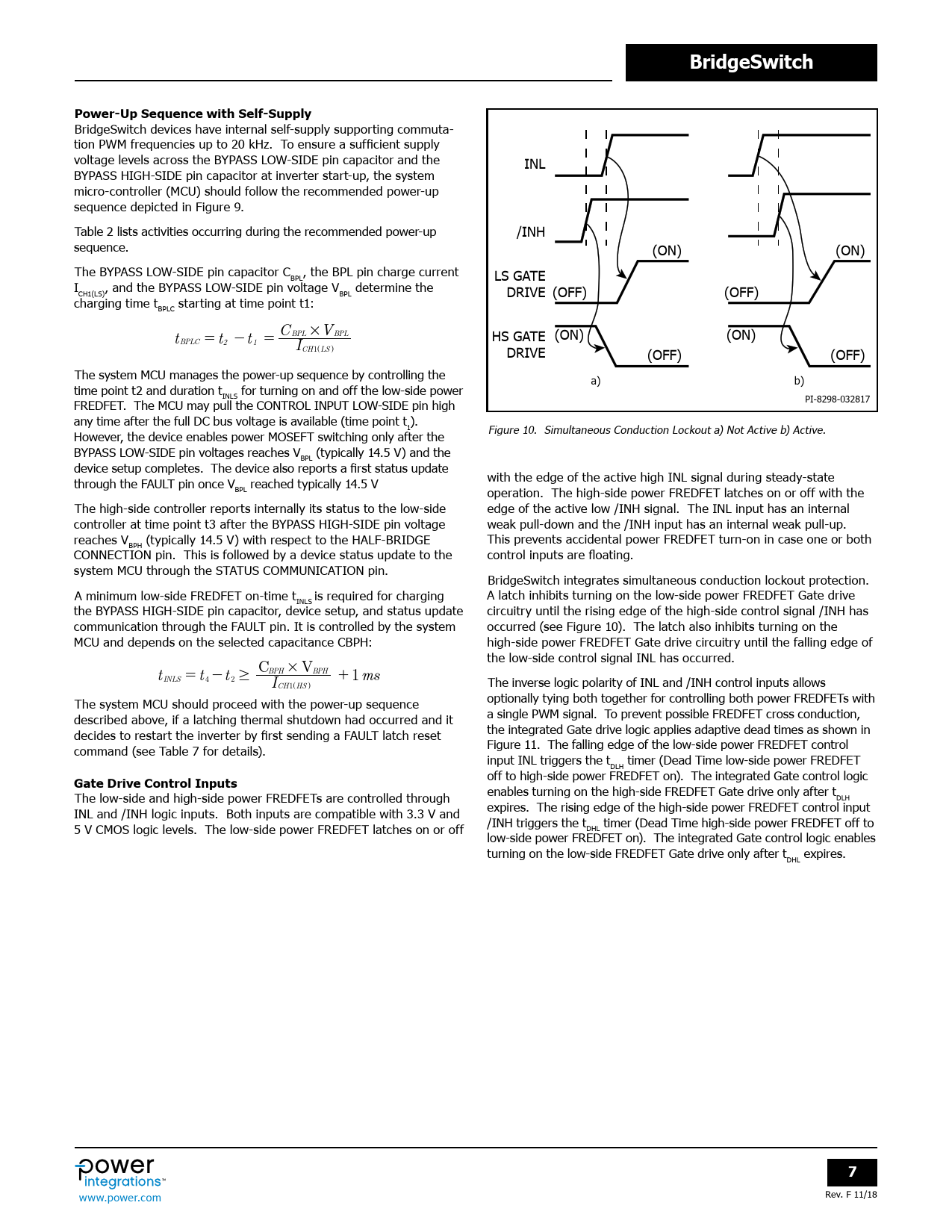 BridgeSwitch devices have internal self-supply supporting commuta- tion PWM frequencies up to 20 kHz. To ensure a sufficient supply voltage levels across the BYPASS LOW-SIDE pin capacitor and the INL BYPASS HIGH-SIDE pin capacitor at inverter start-up, the system micro-control er (MCU) should fol ow the recommended power-up sequence depicted in Figure 9. Table 2 lists activities occurring during the recommended power-up /INH sequence. (ON) (ON) The BYPASS LOW-SIDE pin capacitor C , the BPL pin charge current BPL LS GATE I , and the BYPASS LOW-SIDE pin voltage V determine the CH1(LS) BPL DRIVE (OFF) (OFF) charging time t starting at time point t1: BPLC t BPL # BPL HS GATE (ON) (ON) BPLC = t - t C V = 2 1 ICH1^LSh DRIVE (OFF) (OFF) The system MCU manages the power-up sequence by controlling the a) b) time point t2 and duration t for turning on and off the low-side power INLS FREDFET. The MCU may pull the CONTROL INPUT LOW-SIDE pin high PI-8298-032817 any time after the full DC bus voltage is available (time point t ). 1 However, the device enables power MOSEFT switching only after the Figure 10. Simultaneous Conduction Lockout a) Not Active b) Active. BYPASS LOW-SIDE pin voltages reaches V (typical y 14.5 V) and the BPL device setup completes. The device also reports a first status update through the FAULT pin once V reached typical y 14.5 V with the edge of the active high INL signal during steady-state BPL operation. The high-side power FREDFET latches on or off with the The high-side control er reports internal y its status to the low-side edge of the active low /INH signal. The INL input has an internal control er at time point t3 after the BYPASS HIGH-SIDE pin voltage weak pul -down and the /INH input has an internal weak pull-up. reaches V (typical y 14.5 V) with respect to the HALF-BRIDGE This prevents accidental power FREDFET turn-on in case one or both BPH CONNECTION pin. This is fol owed by a device status update to the control inputs are floating. system MCU through the STATUS COMMUNICATION pin. BridgeSwitch integrates simultaneous conduction lockout protection. A minimum low-side FREDFET on-time t is required for charging A latch inhibits turning on the low-side power FREDFET Gate drive INLS the BYPASS HIGH-SIDE pin capacitor, device setup, and status update circuitry until the rising edge of the high-side control signal /INH has communication through the FAULT pin. It is control ed by the system occurred (see Figure 10). The latch also inhibits turning on the MCU and depends on the selected capacitance CBPH: high-side power FREDFET Gate drive circuitry until the falling edge of the low-side control signal INL has occurred. tINLS = t4 - t CBPH ◊ VBPH 2 $ I + 1 ms CH1^HSh The inverse logic polarity of INL and /INH control inputs al ows The system MCU should proceed with the power-up sequence optional y tying both together for controlling both power FREDFETs with described above, if a latching thermal shutdown had occurred and it a single PWM signal. To prevent possible FREDFET cross conduction, decides to restart the inverter by first sending a FAULT latch reset the integrated Gate drive logic applies adaptive dead times as shown in command (see Table 7 for details). Figure 11. The falling edge of the low-side power FREDFET control input INL triggers the t timer (Dead Time low-side power FREDFET DLH