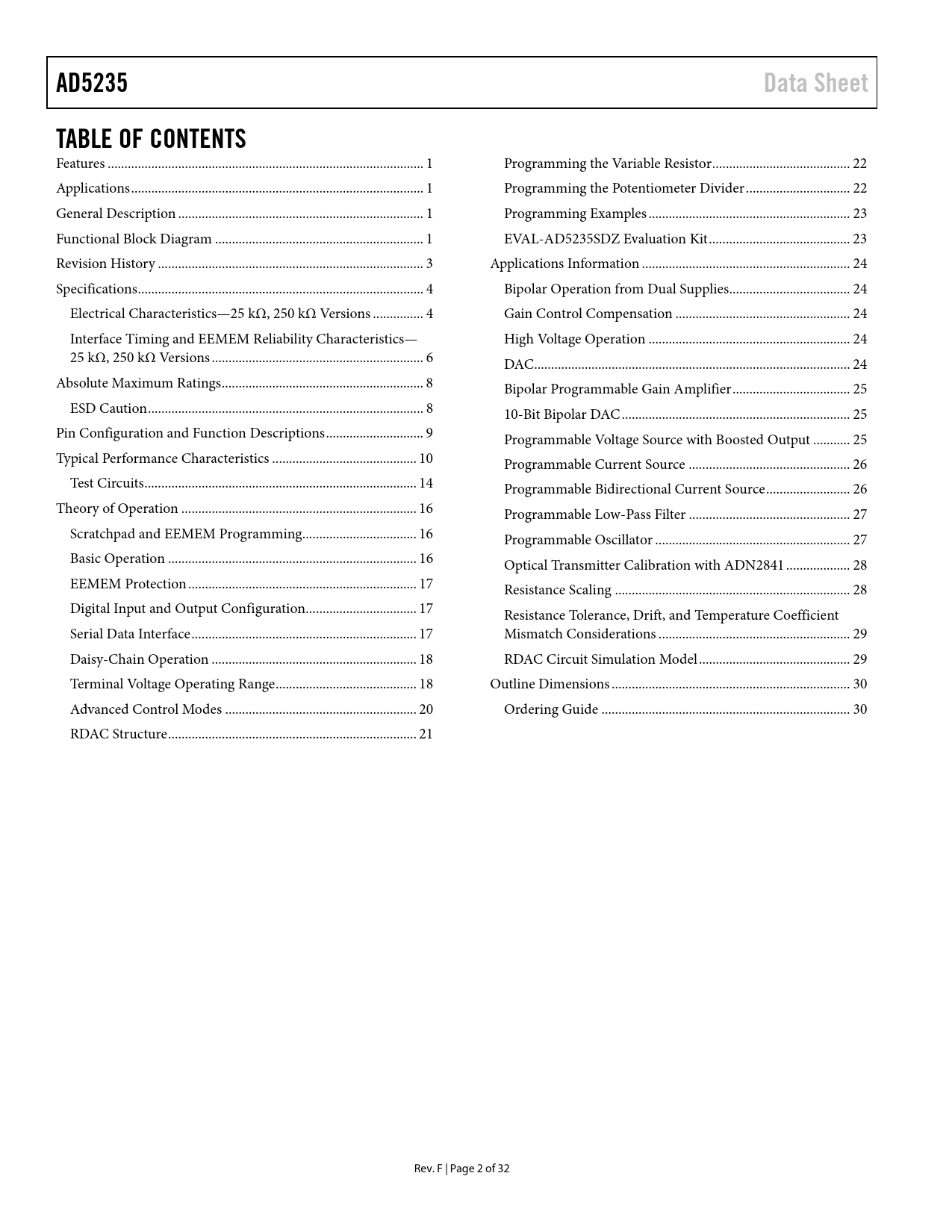 页数 / 页32 / 2 — AD5235. Data Sheet. TABLE OF CONTENTS