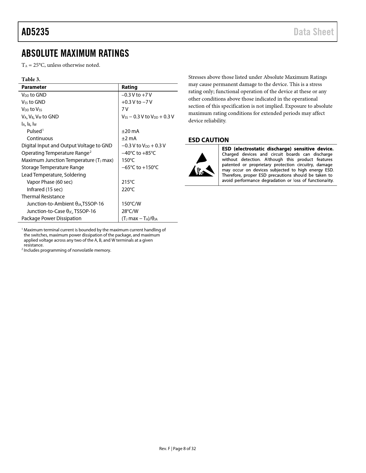 页数 / 页32 / 8 — AD5235. Data Sheet. ABSOLUTE MAXIMUM RATINGS. Table 3. Parameter. Rating. …